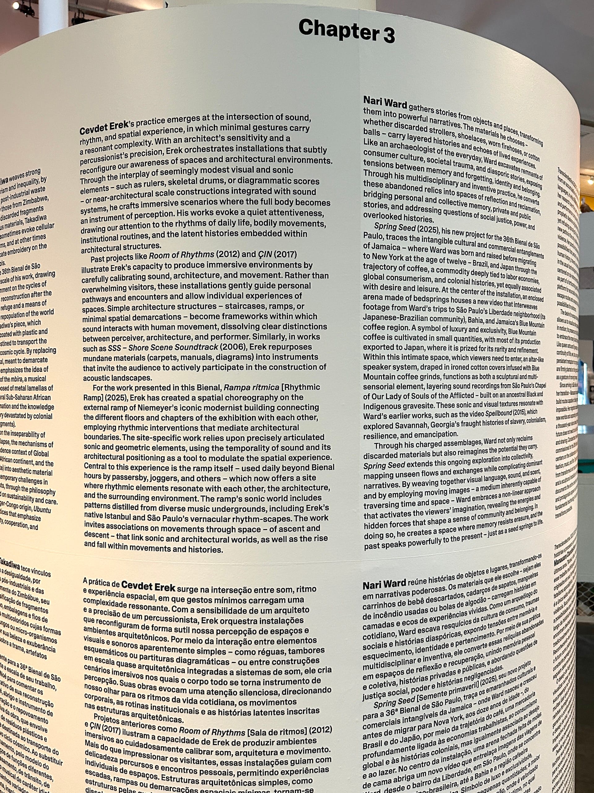 And then I found myself at the 36th Bienal de São Paulo. The show, curated by a team led by Cameroon-born, Berlin-based Bonaventure Soh Bejeng Ndikung, brought together 125 artists and approximately 1,200 artworks installed in a building with 30,000 square meters of space — the size of five American football fields. There was a lot to commend about this thought-provoking exhibition. I’ve done that elsewhere; here I want to focus on the show’s didactics, which were — not to put too fine a point on it — pretty bad.