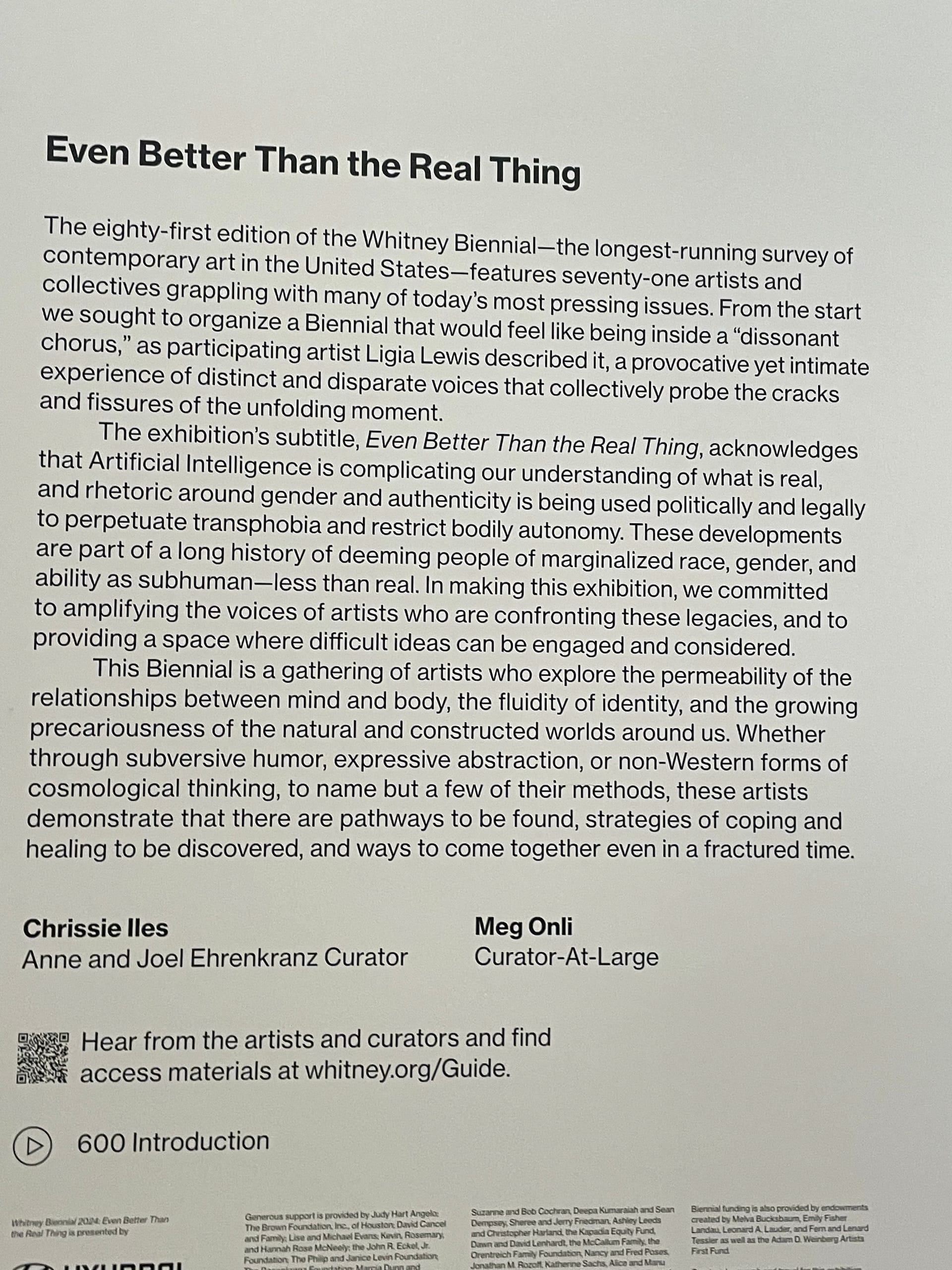 Left: Introductory text for the 2024 Whitney Biennial (photo Natalie Haddad/Hyperallergic); right: Whitney Biennial wall label for artist P. Staff (photo Aruna D'Souza/Hyperallergic)