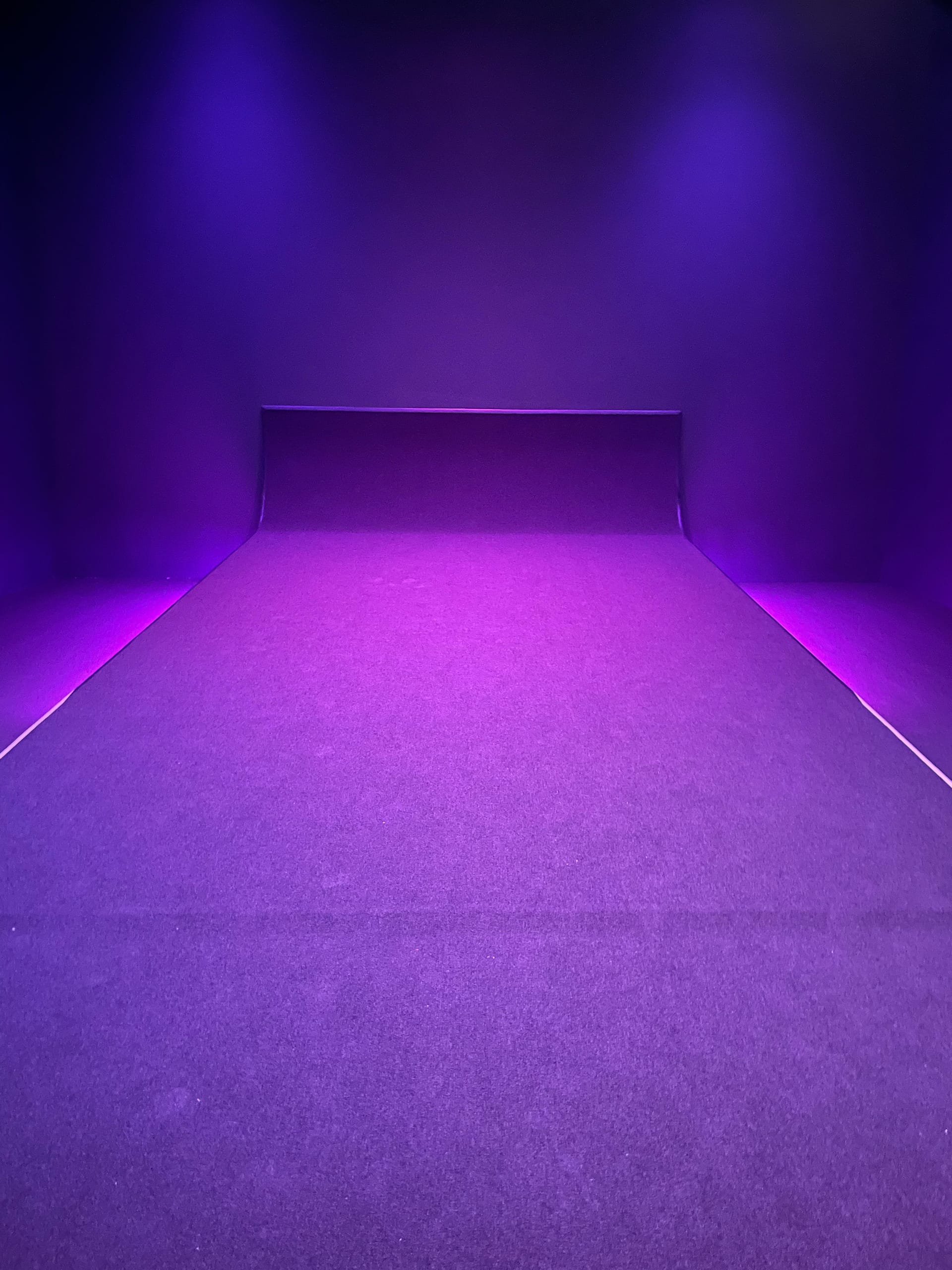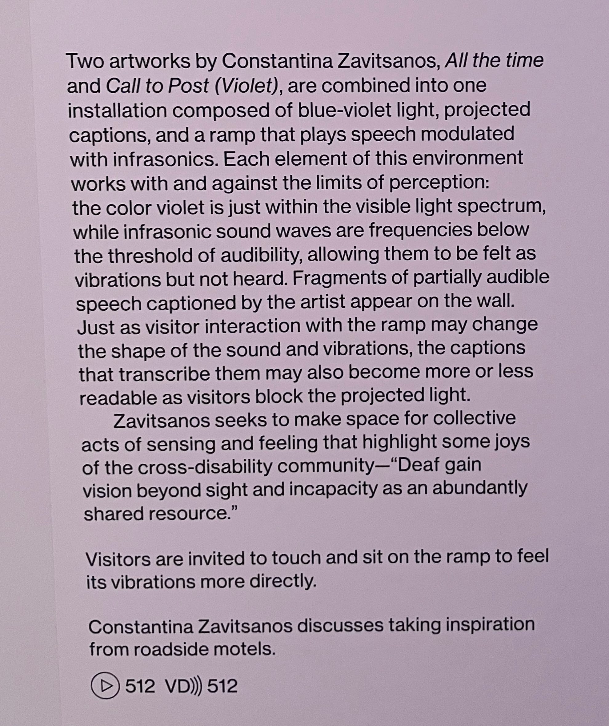 Installation view of Constantina Zavitsanos's "Call to Post (Violet) (2019/24) and "All the Time" (2019) in the 2024 Whitney Biennial, and accompanying wall label (photos Natalie Haddad/Hyperallergic)