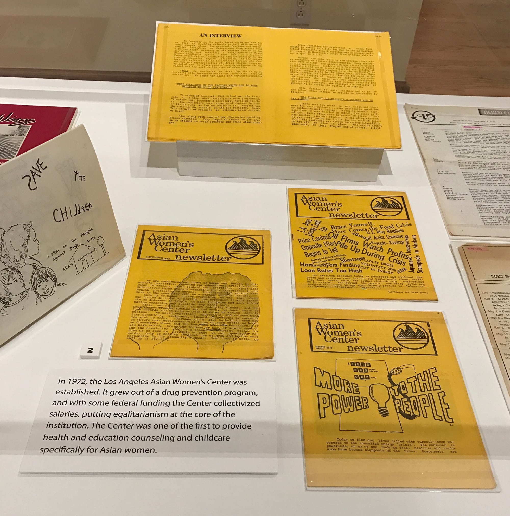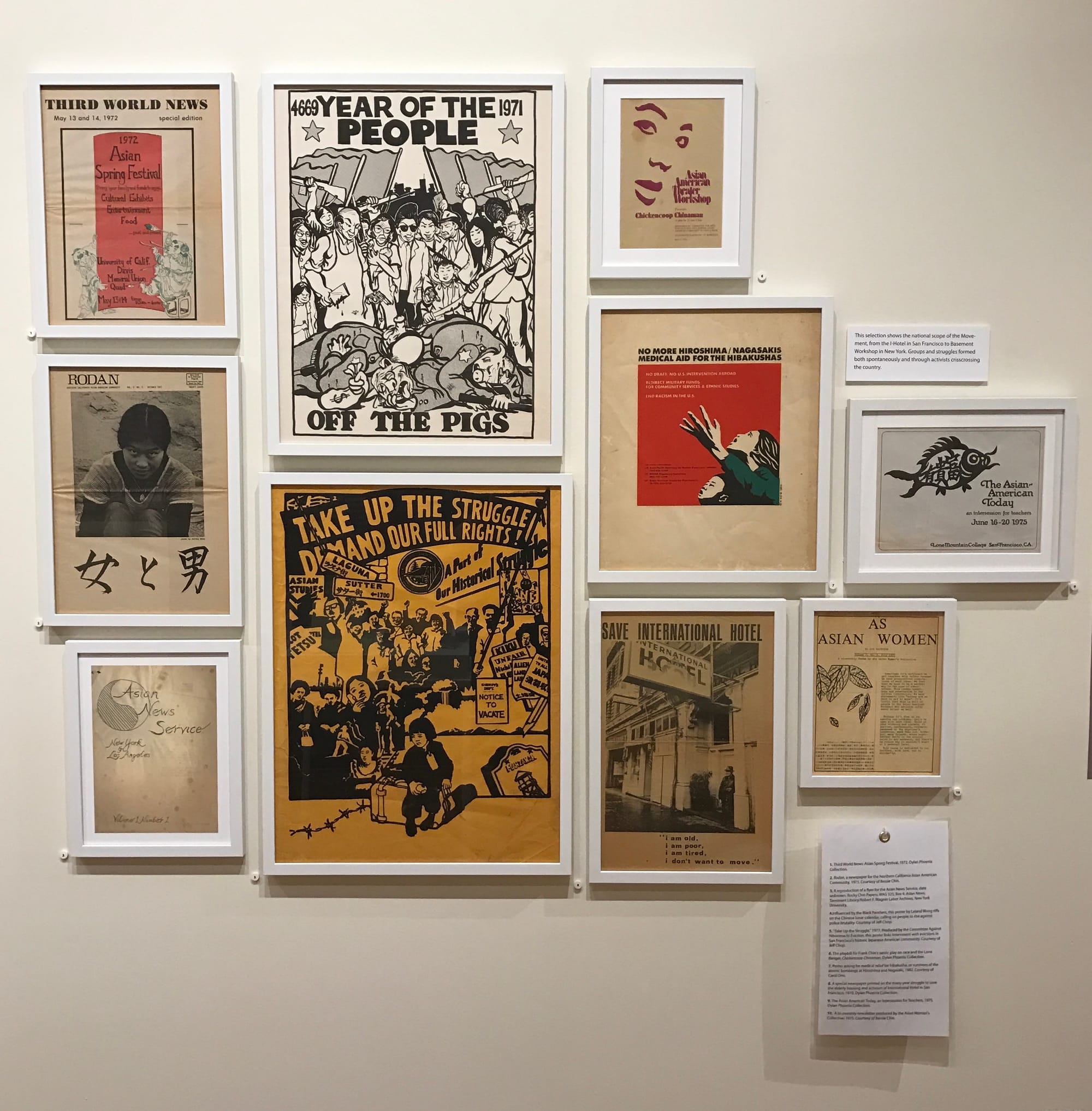 A section of the exhibit titled “Feminism and LGBTQ Movements” features the January 1971 edition of Gidra, whose cover announces it as a “special women’s issue.” The need for a special issue suggests that women’s voices had not been centered or recognized to the degree they should have been. Two photographs depict Gidra volunteers — all female — in the midst of one of several “wrap sessions” that led to the creation of the women’s issue. Despite the radical claims of the movement, Asian American artists and activists had plenty of blind spots, as the exhibit takes pains to demonstrate. Many of the leading members skewed male, cisgender, and heterosexual, with identity politics based on an opposition to “feminized” or “emasculated” personas (the editors of Aiiieeeee!, for example, defined “feminine” writers as not being “truly” Asian American). Facing these limitations, feminist and queer activists organized to create their own support systems and platforms that centered labor, health, and other issues that did not always find a home in the larger movement.