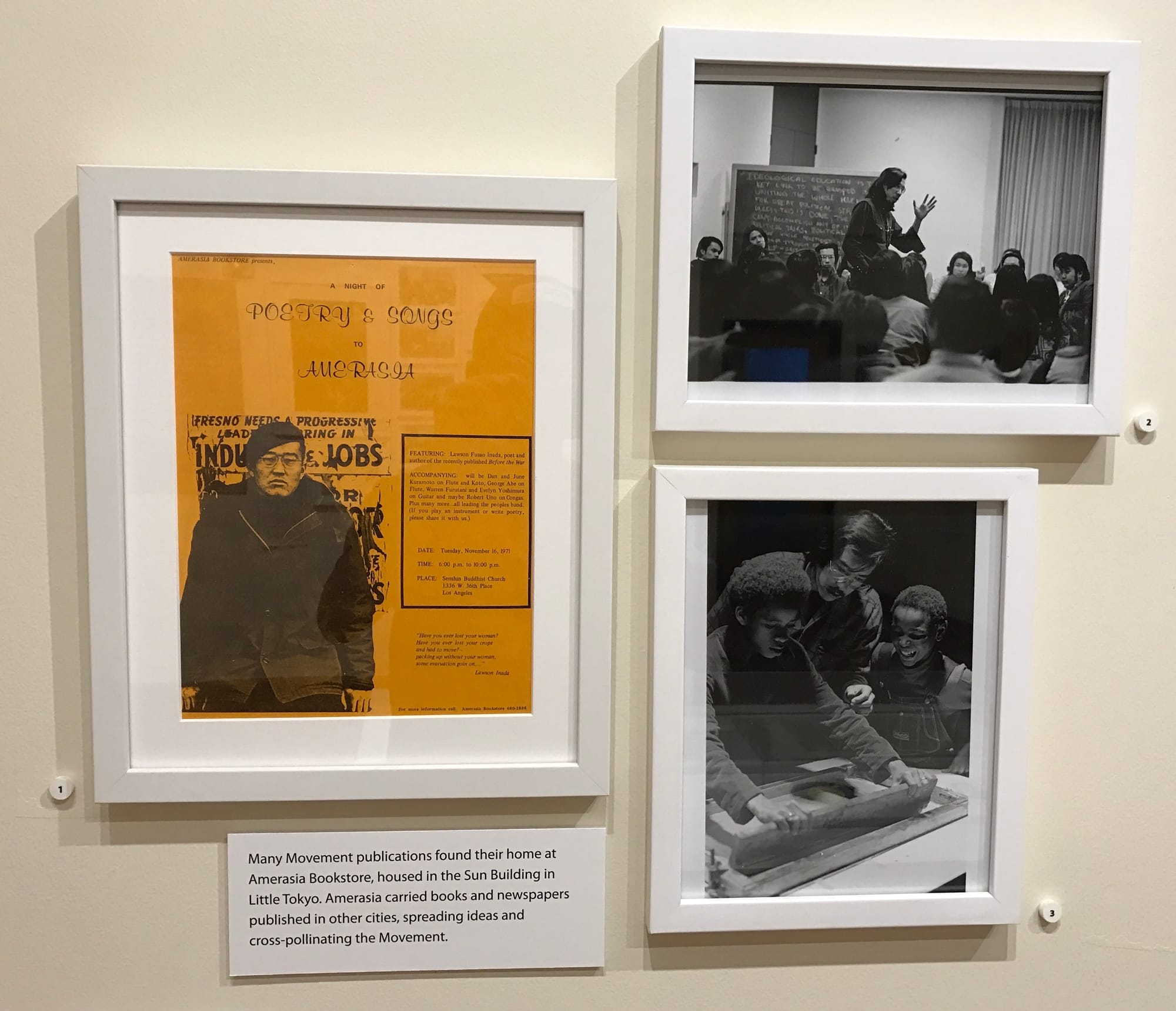 Art became a significant outlet for writers, musicians, visual artists, and filmmakers seeking to voice their identities and political struggles. The Amerasia Bookstore in Little Tokyo, which operated from 1971 through 1992, served as a hub for movement publications and writers like Lawson Inada, a Japanese American poet who spent part of his childhood in an internment camp during World War II. Inada, playwright Frank Chin, and others would go on to publish Aiiieeeee! (1974), the first major anthology of writing by Asian Americans. In her book Serve the People: Making Asian America in the Long Sixties, which is an indispensable companion to the Roots exhibit, writer and filmmaker Karen Ishizuka says:
