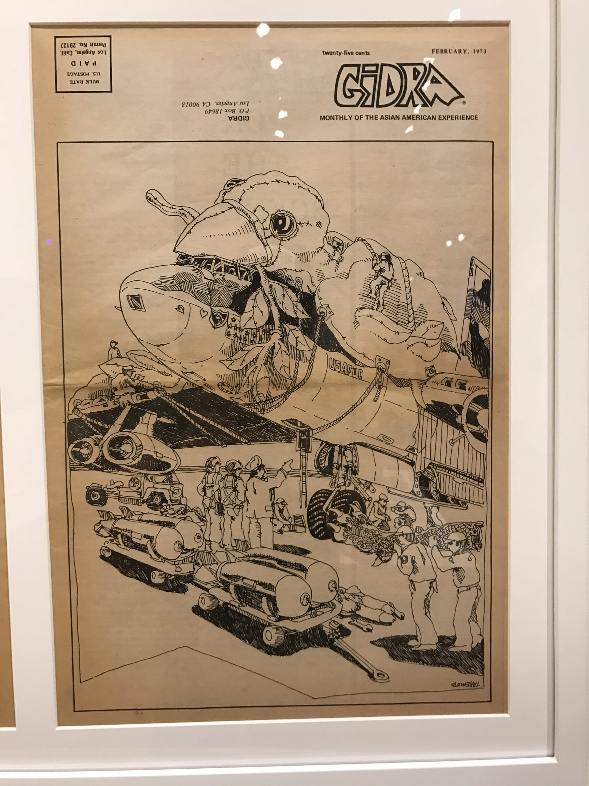 Also on view are several editions of the newspaper Gidra (1969–74), which served as the major communications arm of the Asian American movement. Founded by UCLA students and run entirely by volunteers, the publication produced political analyses, satirical cartoons, and other coverage of everything from the Vietnam War to global capital to cultural stereotypes. Visually rich and politically incisive, the newspaper’s articles and illustrations suggest a patchwork of perspectives and identities that comprised 1970s Asian America.
