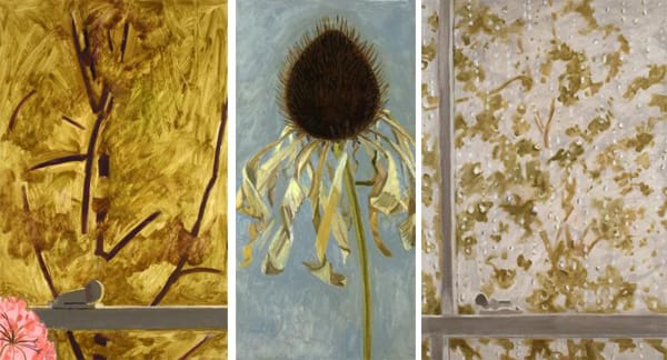The window underscores a desire for order, but everything in Dodd’s window paintings conveys the inevitability of change, disruption, and disorder. In “Rainy Window” (2011), fat raindrops have gathered on the windowpane. Are we trying to look past them at the world outside? Can we look at the drops without seeing the tree branches just beyond? In “Pink Geranium + Window Lock + Ochre Tree” (2011), the artist brings together three focal points, each articulated in a different hue. Coherence might be desired, but it cannot be achieved.