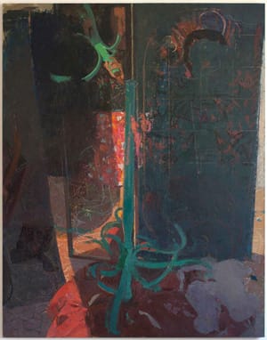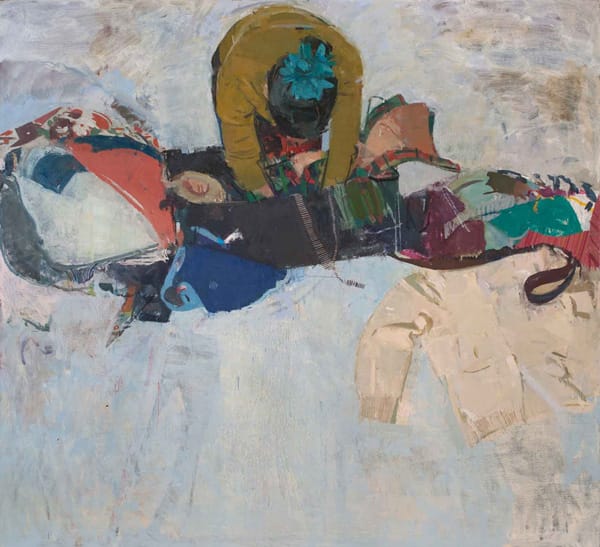 In “As if” (2012), the subject — a woman going through her black canvas travel bag — becomes a meditation on the dialogue between flatness and container. We are looking both at, and down at, her. A sharp underlying tension between volume and flatness runs along every seam and edge. The interlocking forms are abstract, even as each shape can be read as a thing. Planes and forms become tectonic plates pressing against each other. The balance achieved in the painting is momentary because soon all hell might break loose.