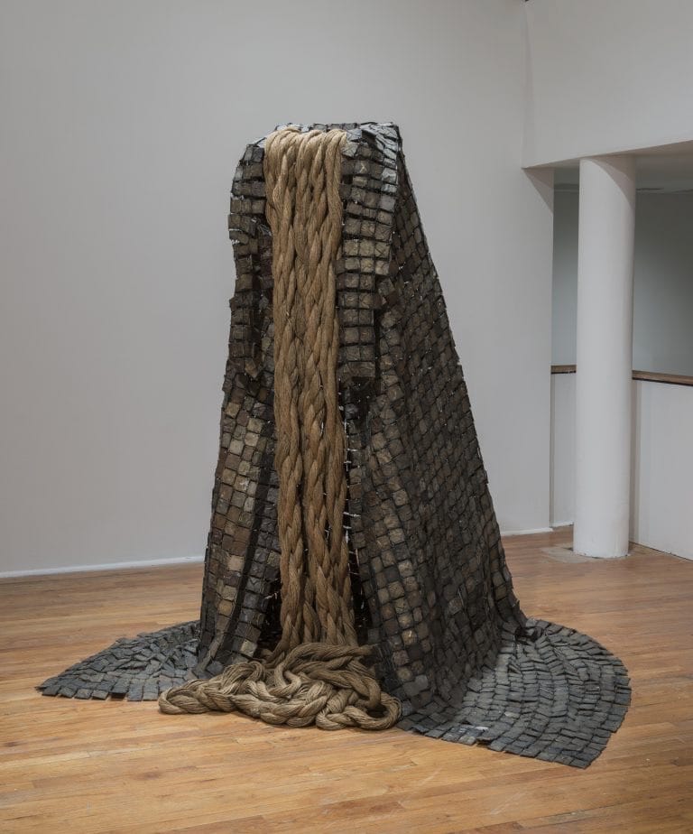 But then there are more encouraging stories. For example, Barbara Chase-Riboud’s work, “The Cape (Le Manteau) or Cleopatra’s Cape” (1973), presents a large, metal mosaic robe, mounted on an armature with a fall of knotted rope spilling from its center down to the floor. The piece evokes an aristocratic dignity and self-regard. In dialogue with the exhibition’s themes, this sense of self is a premise upon which “a more perfect union,” may be formed; it is a way to see the body as a “shrine for the spirit,” and can mount “forms of resistance.” A sense of dignity is also wrapped up in Ben Jones’s work “Shrine for the Spirit” (1976), which takes that African diasporic body and makes it a ritualized set of components that are colorful, vibrant, and sacred. With his “Solon 6:12” (2000), Kori Newkirk takes color and makes it a sweeping curtain of beads that forms a lushly polychromatic landscape that is so deeply beautiful I wonder how he let it go from his studio.