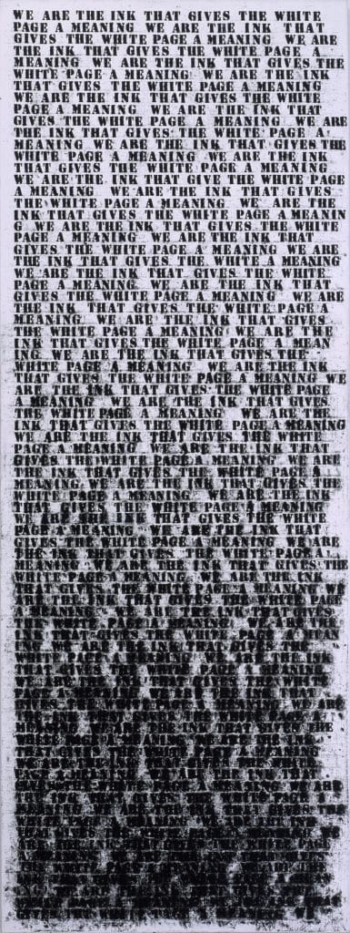 On entering the first gallery, I encounter Glenn Ligon’s “Prisoner of Love #1 (Second Version)” (1992), a text painting in which the phrase “we are the ink that gives the white page a meaning” is repeated over and over and then begins to smudge and become muddy and illegible towards the bottom, as if in the repetition (because it is not heard the first time) the sentiment becomes part of the cultural noise that renders us all crying voices in a cacophonous wilderness — each of us keening with one another as our habitat shrinks and we are inched to oblivion. Zoe Strauss gets at the anger those of us feel who grew into adulthood under circumstances that impel us to see the social world as a mean, mercenary place consistently taking advantage of us, and that taught us to fight based not only on hatred of our place in this world, but hatred of ourselves as well. Her “If You Reading This, Philadelphia” shows how that hatred spills out and spreads everywhere.