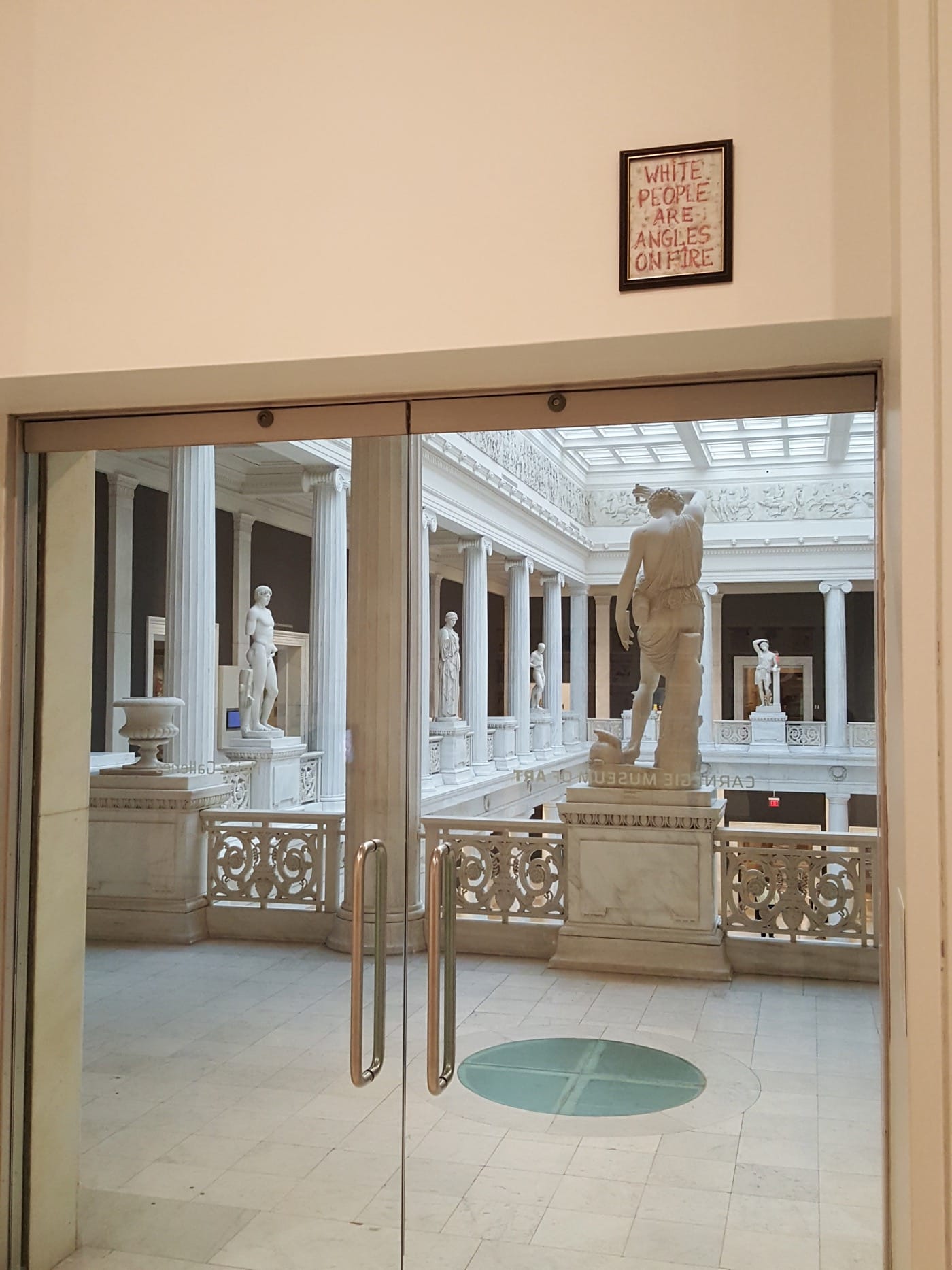 But there is a juxtaposition in the exhibition that saves me from the disappointment I’m left with, where Pope L. has interjected one of his text pieces. Most of these pieces by Pope L. are displayed in the entranceways between galleries, and they felt too editorial for me, like comments in the comment section of an online article. But here he puts the text up against the glass partition between this show and the adjacent gallery full of (white) marble figurative statuaries from antiquity that now call to mind Sarah Bond’s trenchant critique of the idea that this work devoid of color is too often taken to represent Western civilization. It reads “white people are angles on fire.” Right below the sign, one can see that group of alabaster bodies, suggesting the classical ideal they represent. I can’t tell if this is due to the curation or the artist’s insistence, but either way, it’s insightful and pointed, and shows the potential for contemporary work to bring deeper awareness to its own physical context and thus exist in dialogue rather than a pretend solipsism.