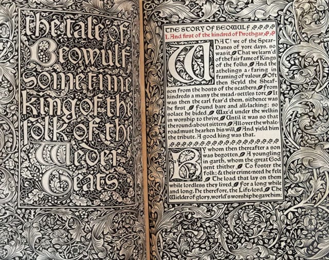 The Werkstatte and Arts and Crafts movements exemplify this. William Morris, leader of Arts and Crafts, rebelled against the shoddiness of mass-produced goods; he was dedicated to preserving traditional processes like papermaking, printing, and bookbinding. “At his Kelmscott Press, he designed a series of stunning books printed by hand and bound in vellum, in the style of an earlier century,” says O’Donnell. “The Anglo-Saxon epic Beowulf’s heroic scale, vivid wordplay, and origins in spoken narrative made it a natural choice for Morris, appealing to his love of the archaic and vernacular.”