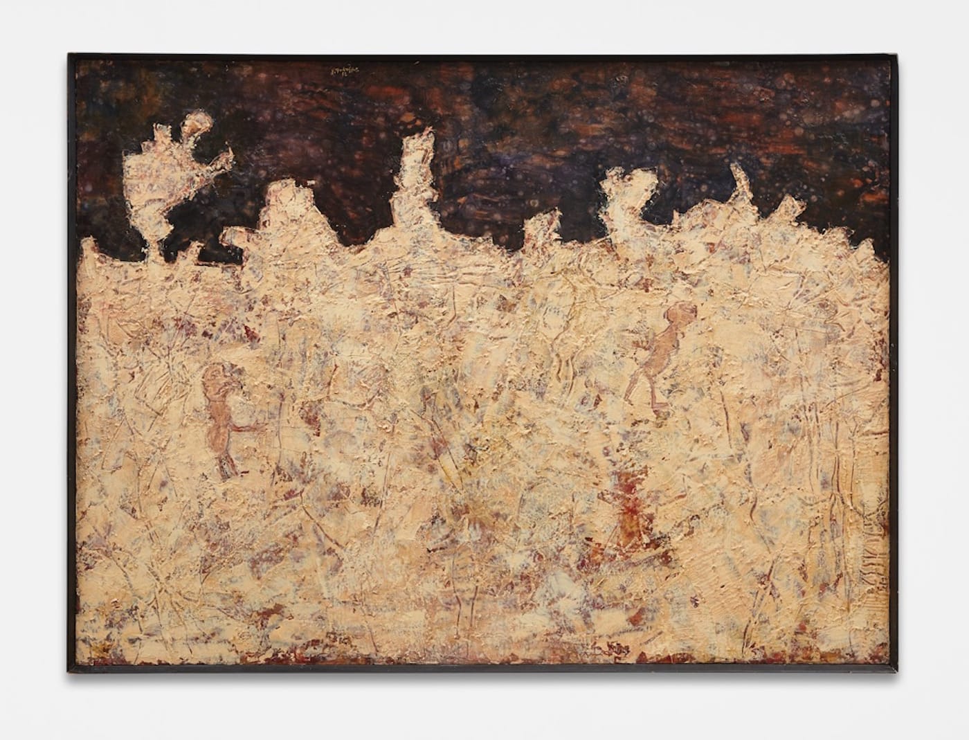 But in the case of the current exhibition, a second glance at the paintings by each artist, built from multifarious scraps of objects, synthetic matter, dirt, and junk, gives these varied surfaces a weirdly consecrated resonance. Possibly due to Dubuffet’s more intimate scale, one enters more quickly into his pithy, ambiguous landscapes than into Poons’ sprawling topographic cornucopia. Both artists, in fact, veer toward the unbridled limits of profound insolence, which suggests that their paintings fly in the face of the status quo in a way that few painters in recent years are capable of doing or even comprehending. When I glance at Poons’ “Cry Le June” (1990), I am taken by the specter of conflict giving way to inevitable sublimation; when I leap into the entrails of Dubuffet’s “Soleil san Vertu” (1952), I sense pangs of conflict gliding up through the dark moss. There is nothing to prove in these paintings other than confirming that the emotions they project contain their own reality, which we are unable to pin down in any absolute way.