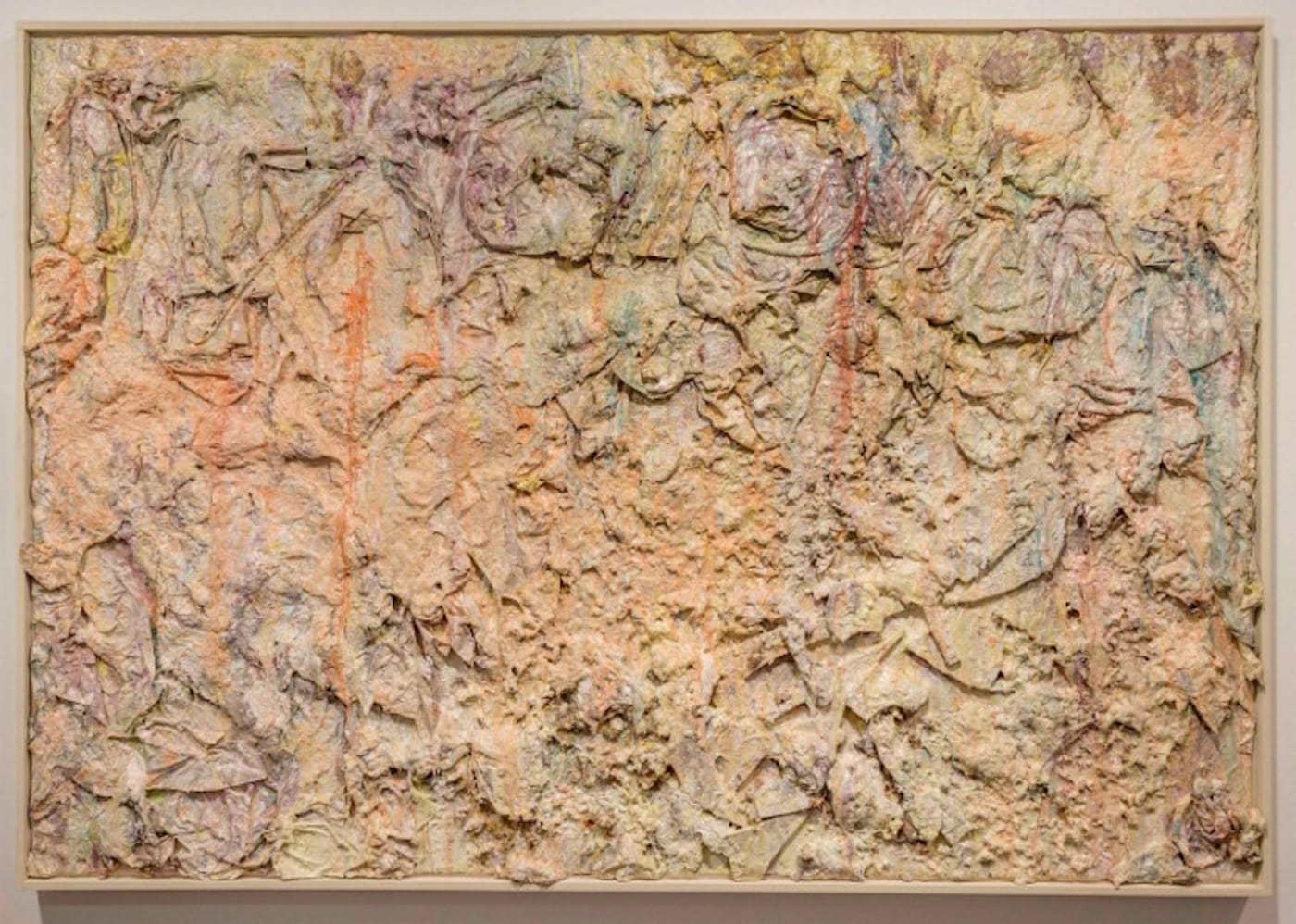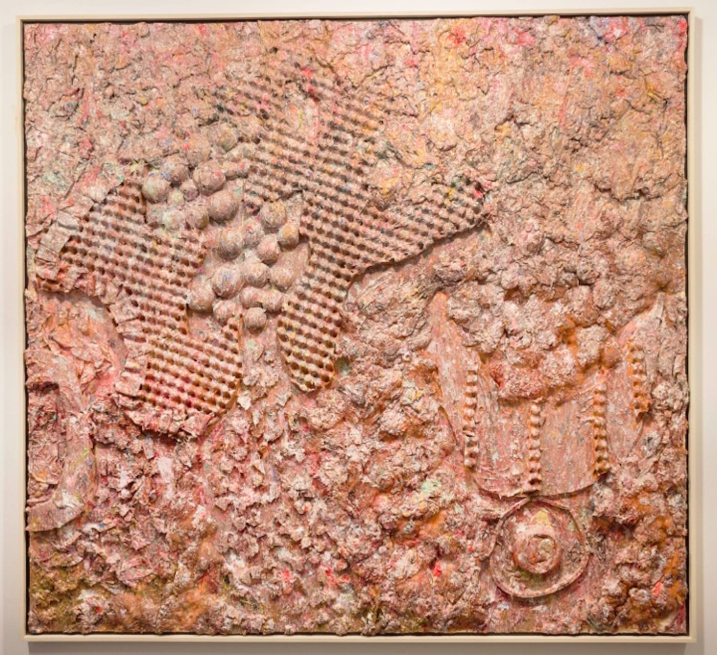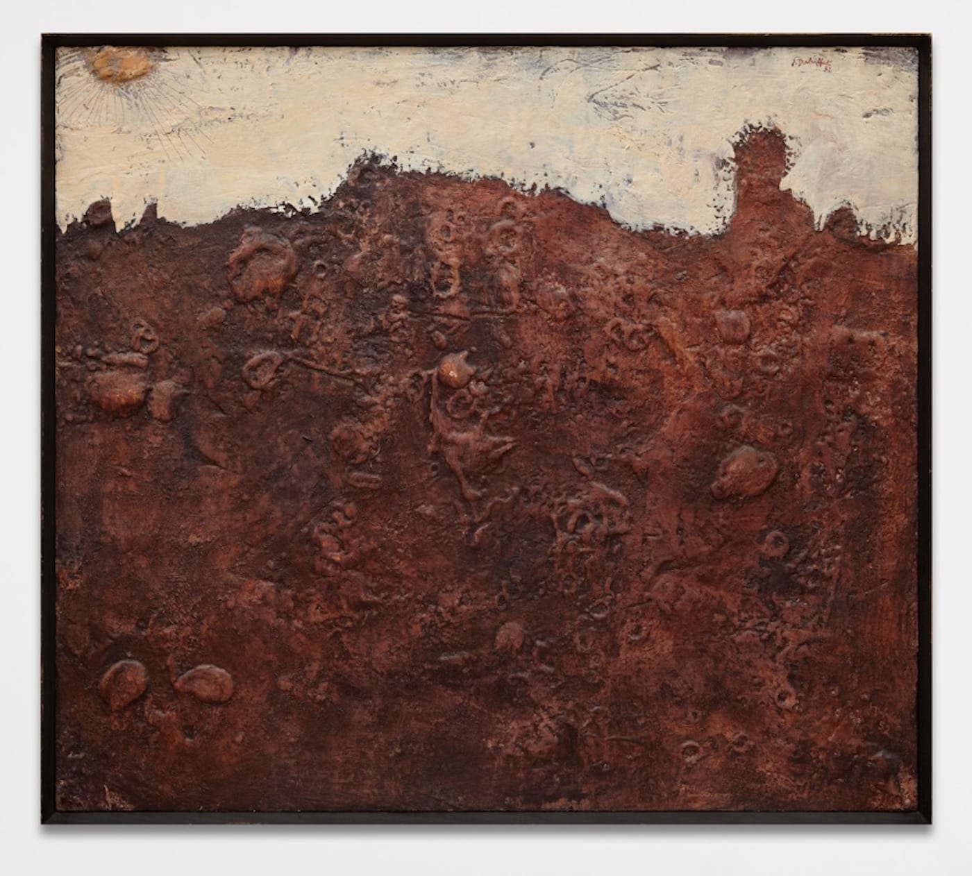 Dubuffet made his point clear in his famous “anti-culture” lecture at the Chicago Arts Club in 1951, where he advocated going against the conventions of beauty in art and in favor of more deeply embedded emotional and traumatic revelations. Dubuffet developed the “art brut” method of painting in Paris in the mid-1940s, which he initially discovered in the writings of Swiss psychiatrist and art historian Hans Prinzhorn. Inspired by Prinzhorn’s studies of aberrant patients, Dubuffet went on to observe paintings by insane inmates and disturbed children, as well as objects produced by “primitive” outsiders who were unaware that what they were doing might be considered art. In all cases, Dubuffet gave serious attention to the errant materials these artists used, including earthly and bodily effects. Eventually the artist began to mix these materials into his oil pigments, which provided the ground for his paintings, further endorsing the primal “hands-on” effect that becomes visible in the artist’s tactile organization of space.