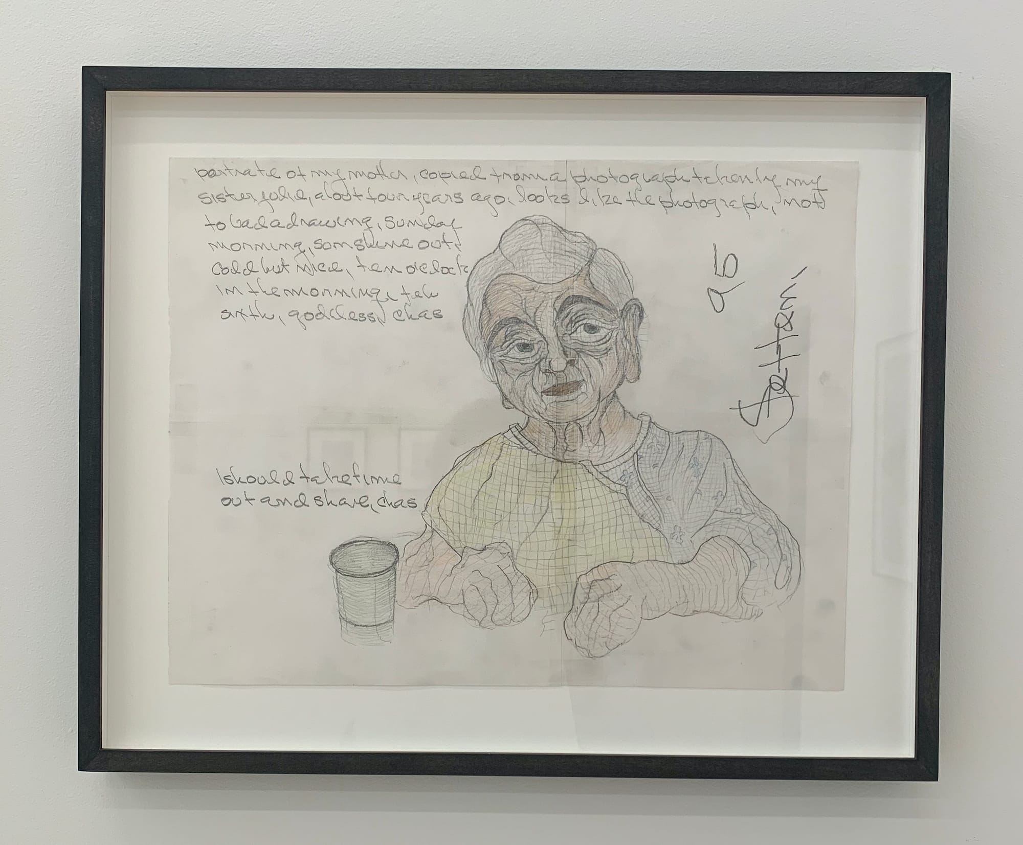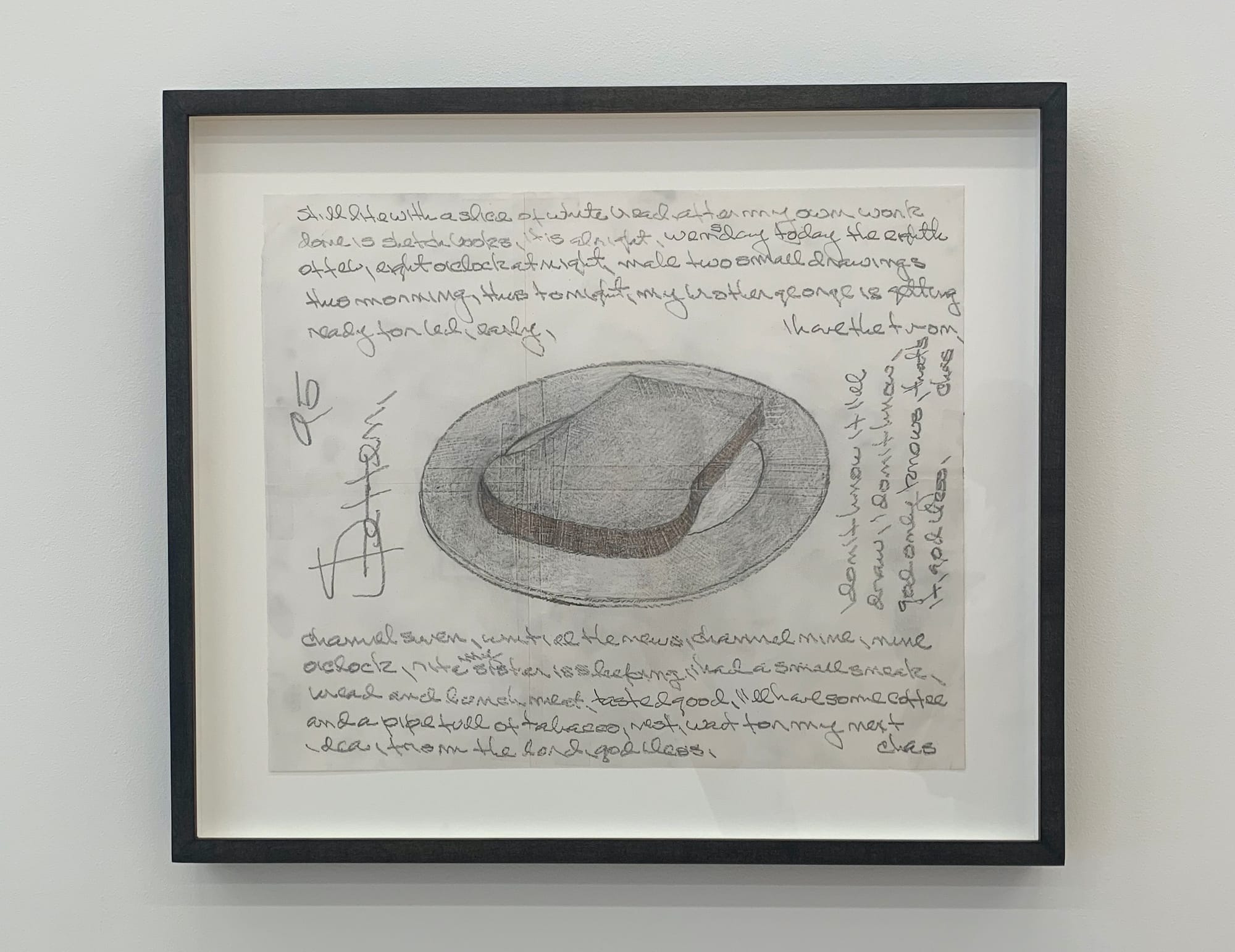 In his final year, Steffen also devoted time to copying classic works, albeit in his own inimitable way. Van Gogh’s “The Potato Eaters” (1885) was of particular fascination, inspiring multiple drawings and studies. Steffen’s sinuous lines, cross hatching, and shading feel at home here, in large part because a light source (the hanging oil lamp) bends the shadows within the darkened room and illuminates his subjects’ blank faces. He drew the work on six smaller pieces of paper and fastened them together with scotch tape, a poignant echo of the humble occupations of van Gogh’s subjects. Across the gallery hangs Steffen’s graphite drawing of a slice of white bread on a circular plate, surrounded by his written commentary and signature benediction (“god bless”). There’s no cartoonish amplification, no bracing color, just a simple rendering, a practice as sustaining as daily bread.