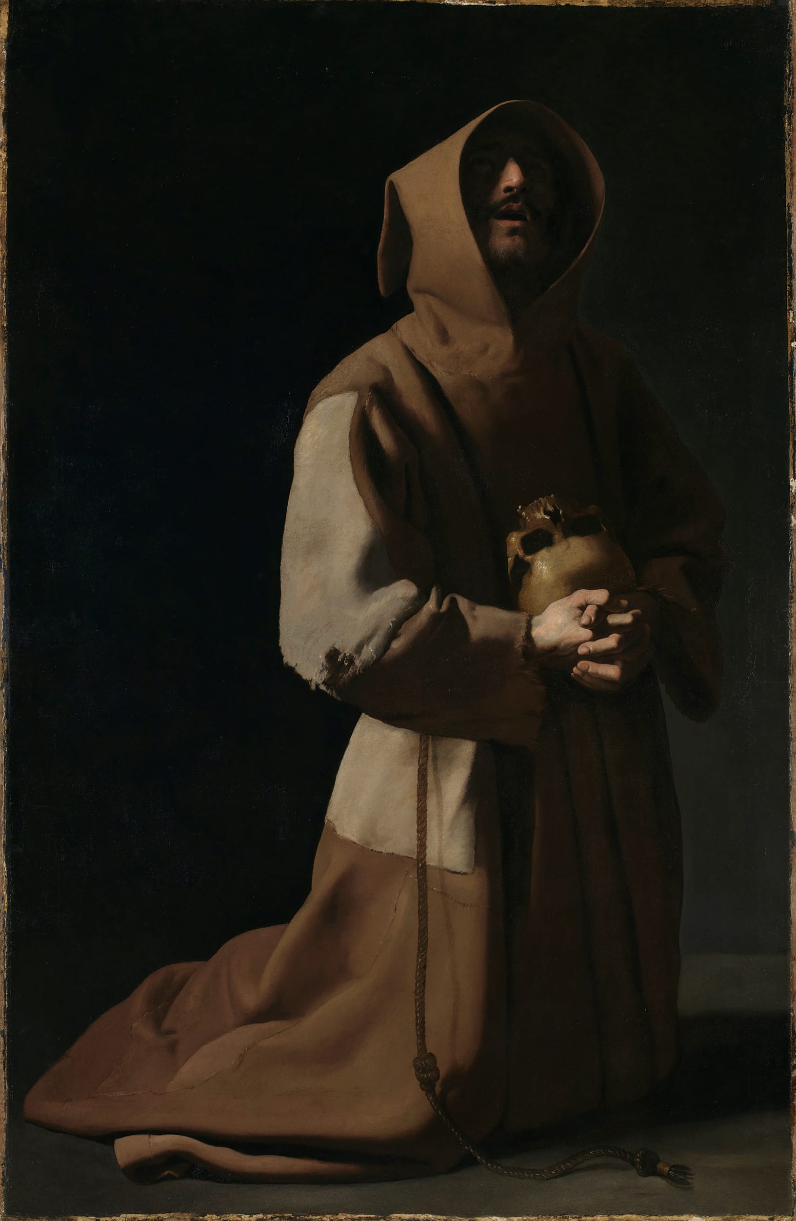 It is the haunting hooded cowl that serves as the focus in Francisco de Zurbarán’s “Saint Francis in Meditation,” painted in Seville between 1635 and 1639. The saint is kneeling and alone in his stone cell, the very embodiment of brokenness and self-abnegation. He clutches a skull that is angled (by he who clutches it with such fervor) to stare back up at him eyelessly. His mouth is agape, his eyes barely visible, his habit ragged at the elbow — this is the man who was called il poverello (the poor man) of Assisi.