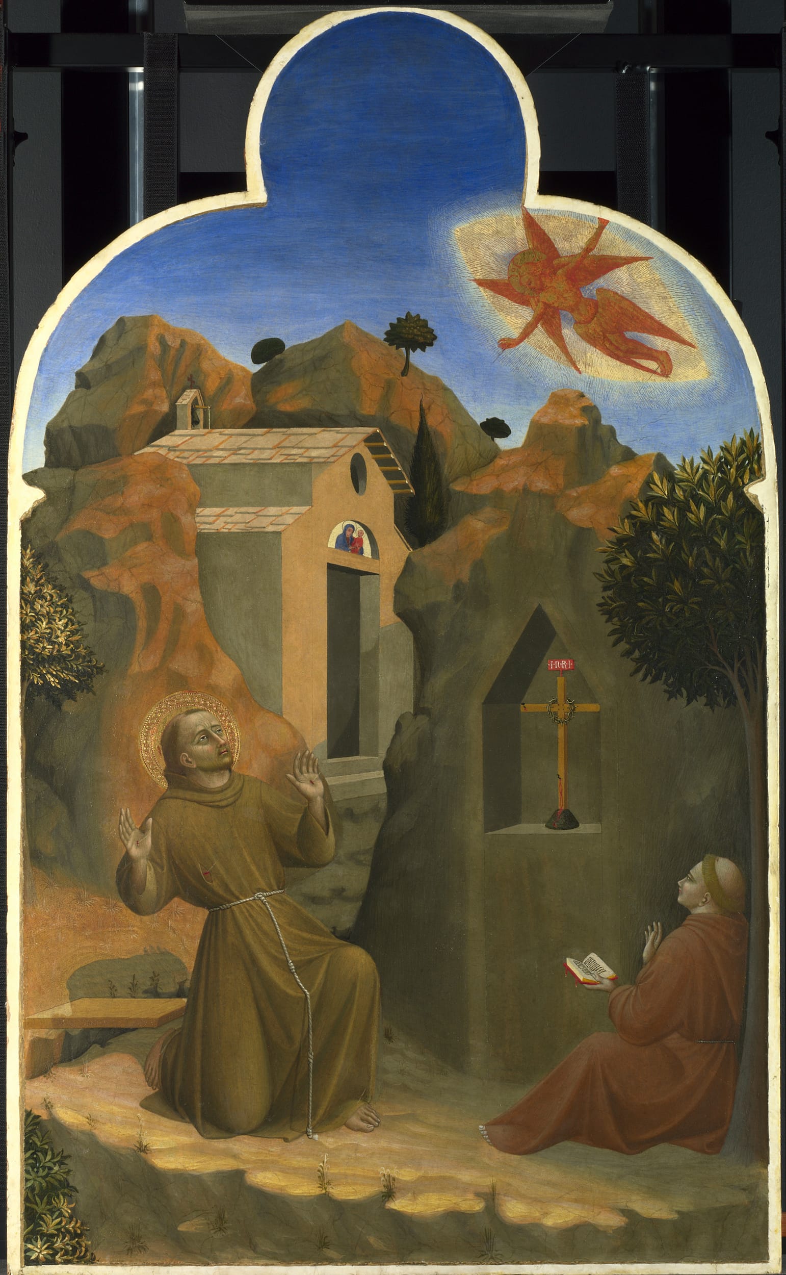 The saint’s life had much to do with bodily pain, and many paintings show off his receipt of the stigmata of Christ in his palms as solid proof of his calling. Curiously, we onlookers often do not register much of that pain ourselves when we look at many of these early paintings because they are are so sweet to behold — the glorious color combinations of Sassetta’s cycle of painted panels, for example. You could almost say there is too much sweetness about some of these early responses; Botticelli shows him engulfed by winged angels with their instruments, treading the gold ground of heavenly air. Such stagings ease away the pain, and almost seem to aestheticize the saint.