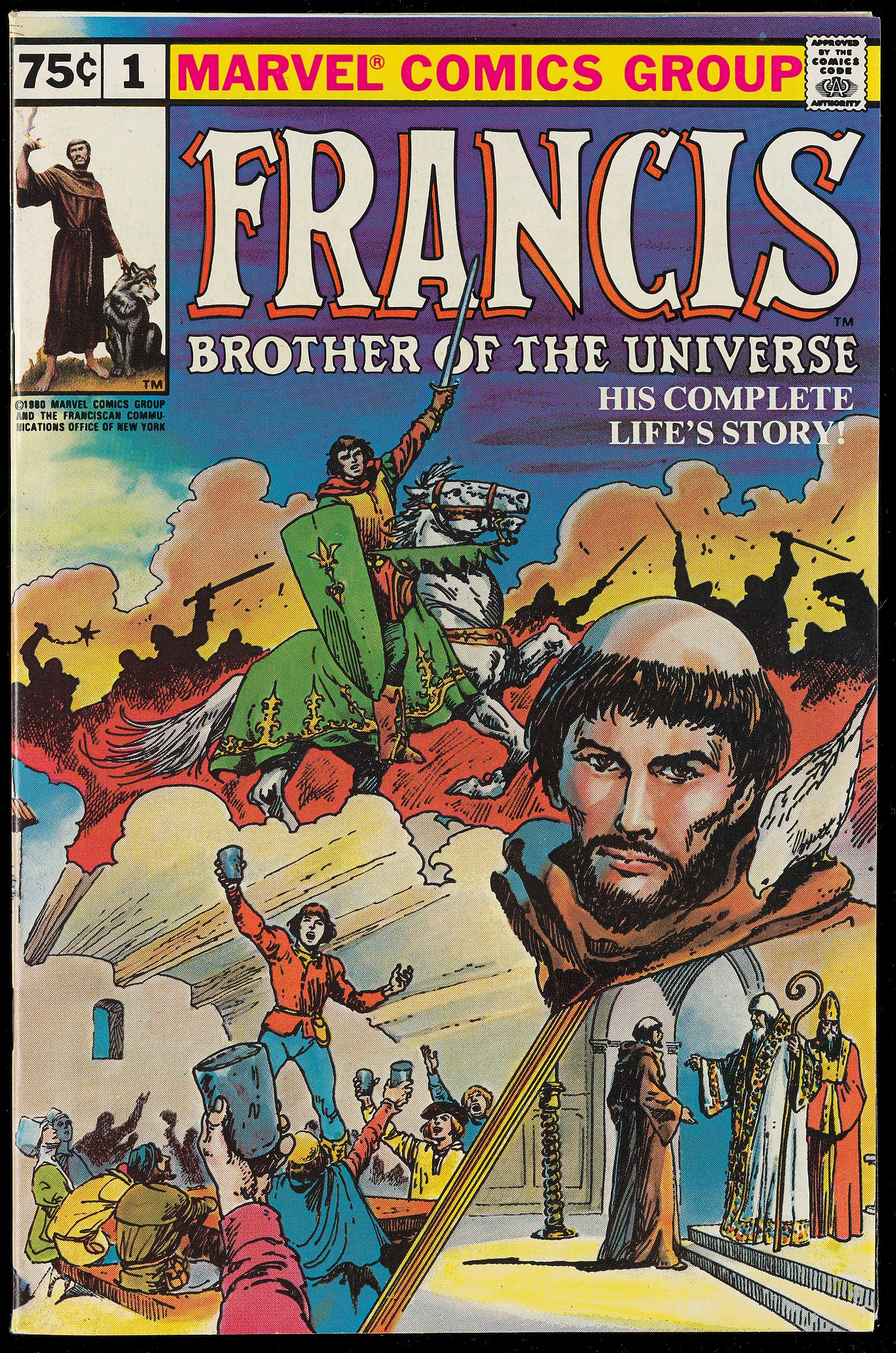 Other unusual developments begin in the second half of the 20th century. The idea of Saint Francis takes on muscularity, power, and forcefulness as never before, for two reasons. First, his image begins to be associated with liberation theology and its empowerment of the individual body and soul. Then, in 1980, comes the final benediction of modernity: Marvel Comics raise him up as an exemplary warrior for goodness, an action man of superhero status, by telling his life story in Francis, Brother of the Universe, in which he goes from being a teenage party animal to a tonsured friar. Its most dramatic scene shows Saint Francis receiving the stigmata as flashing rays shoot from Christ’s wounds.