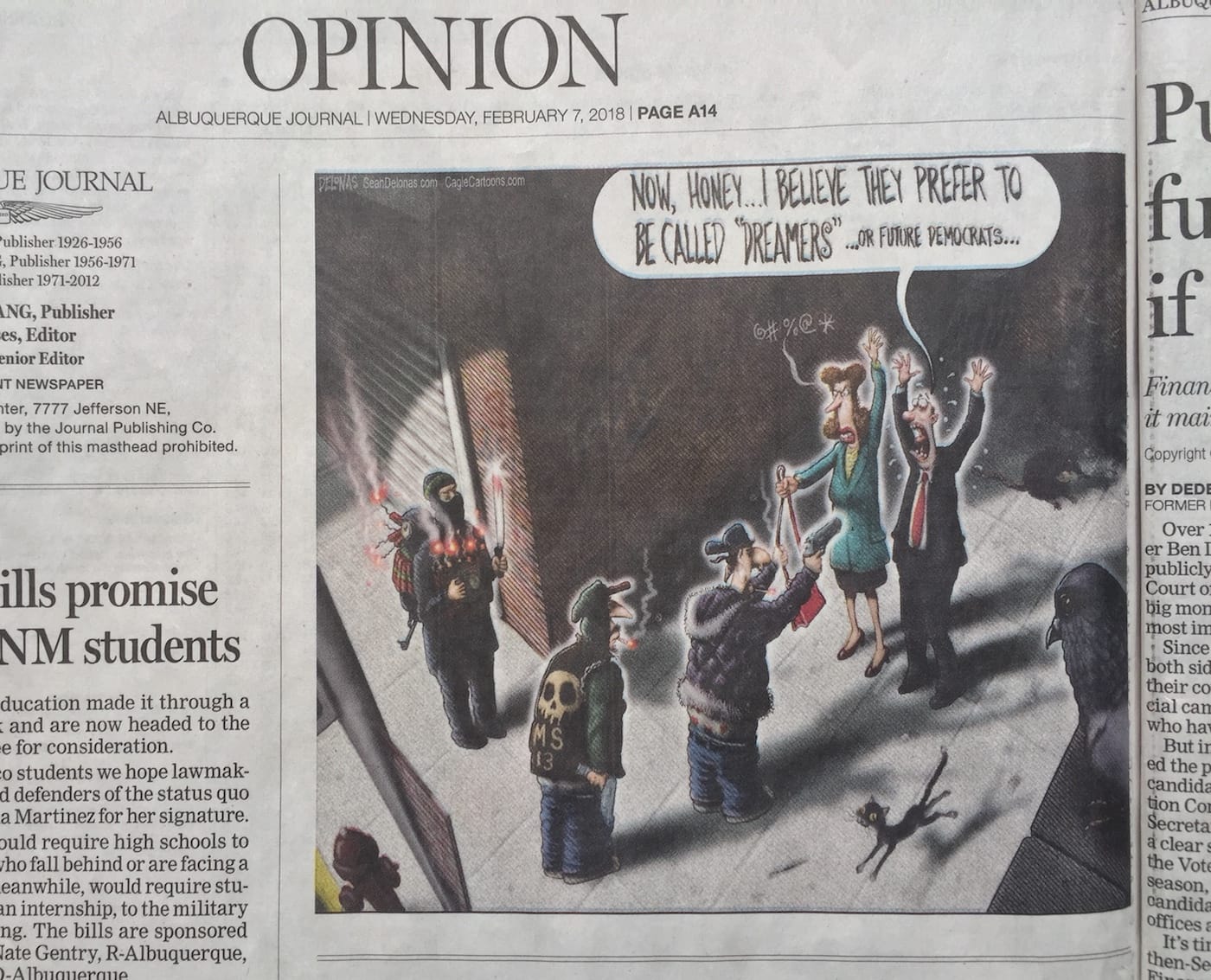 ALBUQUERQUE — Last week, leaders, activists, and intellectuals across New Mexico condemned and protested the Albuquerque Journal for an editorial cartoon that conflates international gangs with the children of immigrants. New Mexico Senators Martin Heinrich and Tom Udall called the cartoon racist, as did Albuquerque’s newly-elected mayor Tim Keller, and State Senator Linda Lopez, among others. The cartoonist, Sean Delonas, faced similar accusations of racism in February 2009 for a New York Post cartoon, in which NYPD officers shoot a monkey dead and compare it to President Obama.