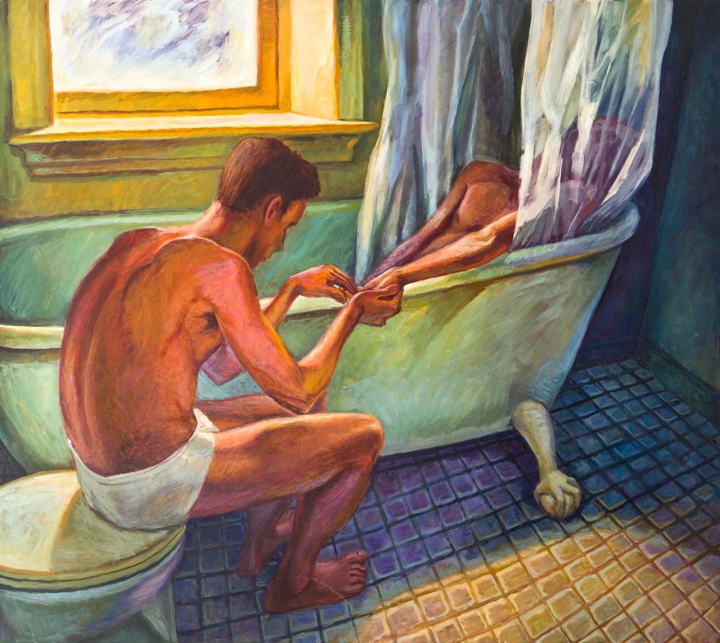 In the same room, Hugh Steers’s arresting 1992 painting “Bath Curtain” weighs heavy as ever. A young couple — one man perched on the edge of a toilet seat, the other reclined in a claw-foot tub — tenderly cup hands. A plastic curtain obscures the latter figure’s face, resting over it like a veil or a gilded funerary mask. It’s a heartbreaking image, and one that underscores the urgent need for systemic medical attention at a time when, as the exhibition astutely points out, healthcare and traditional models of caregiving were rigged against queer communities.