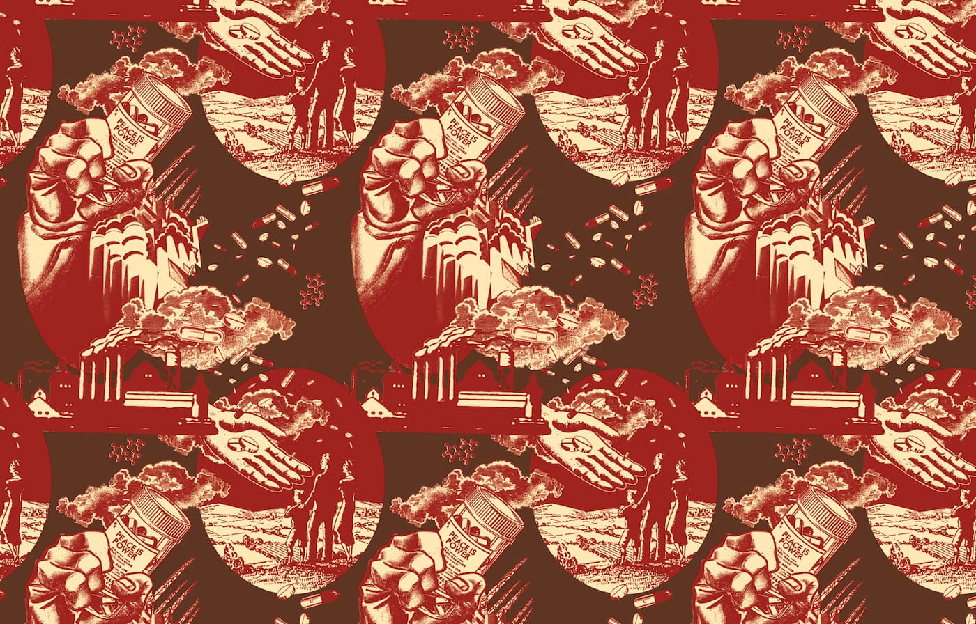 One prominent feature of the exhibition, which can at times feel a bit heavy-handed, is the inclusion of architectural and residential leitmotifs — curatorial interventions threaded throughout the space. Crown molding, curtains, and wallpaper serve as facile symbols of domesticity, though these latter two elements, interestingly, host a collection of decorative patterns by a relatively more international crop of artists. Examples by Americans Carl George and Avram Finkelstein, who caricatures the pharmaceutical industry’s grip on self-care, are complemented by designs from Cuban-born Rafael Sánchez, Canadian-born Anthea Black, and South Korean-born Yeonjune Jung. Jung’s printed wallpaper from 2014, for example, camouflages acts of anti-LGBTQ violence and policing within otherwise bucolic vignettes — an approach conceptually reminiscent of Robert Gober’s “Hanging Man / Sleeping Man” (1989).