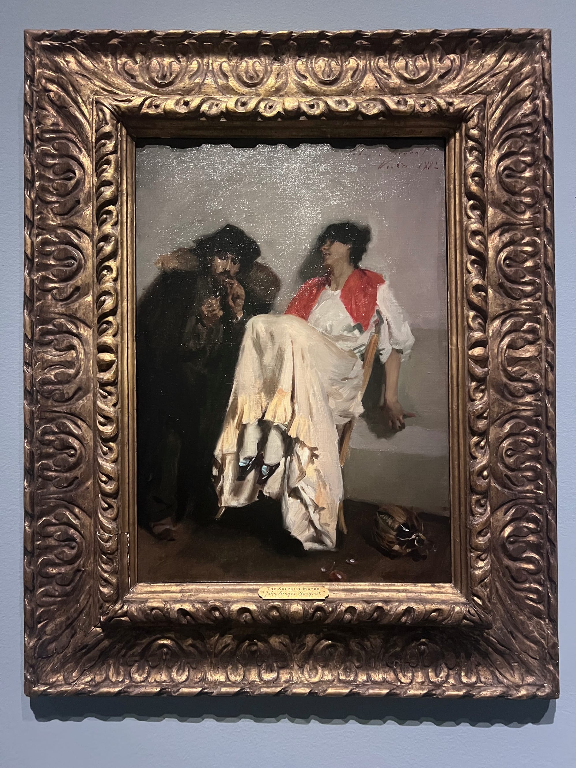Indeed, it’s in painting people that Sargent really shines, and he makes them shine too. They are almost always depicted asymmetrically, and captured mid-movement, as if to underscore that they surpass the boundaries of the frame. For instance, “Portrait of Frances Sherborne Ridley Watts” (1877), which marked his public debut when it was shown at the Paris salon, seems to capture this family friend shifting in her seat, the buttons of her dress snaking sinuously around her body. “The Sulphur Match” (1882) is a moralizing genre painting, in this case a warning against the dangers of drinking, but the tender specificity of the figures — the woman’s feet perched up on a chair tilted precariously back, held in delicate balance by her fingertips only — transcends its container.