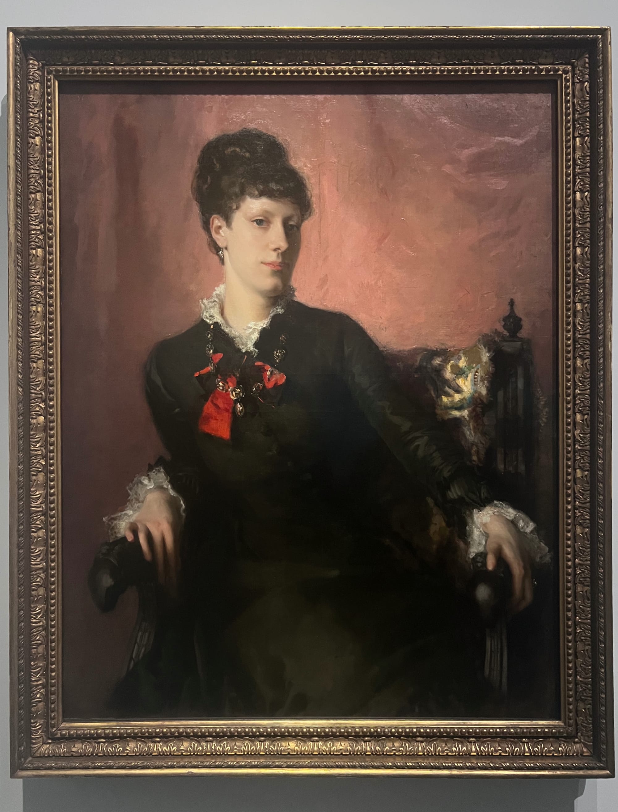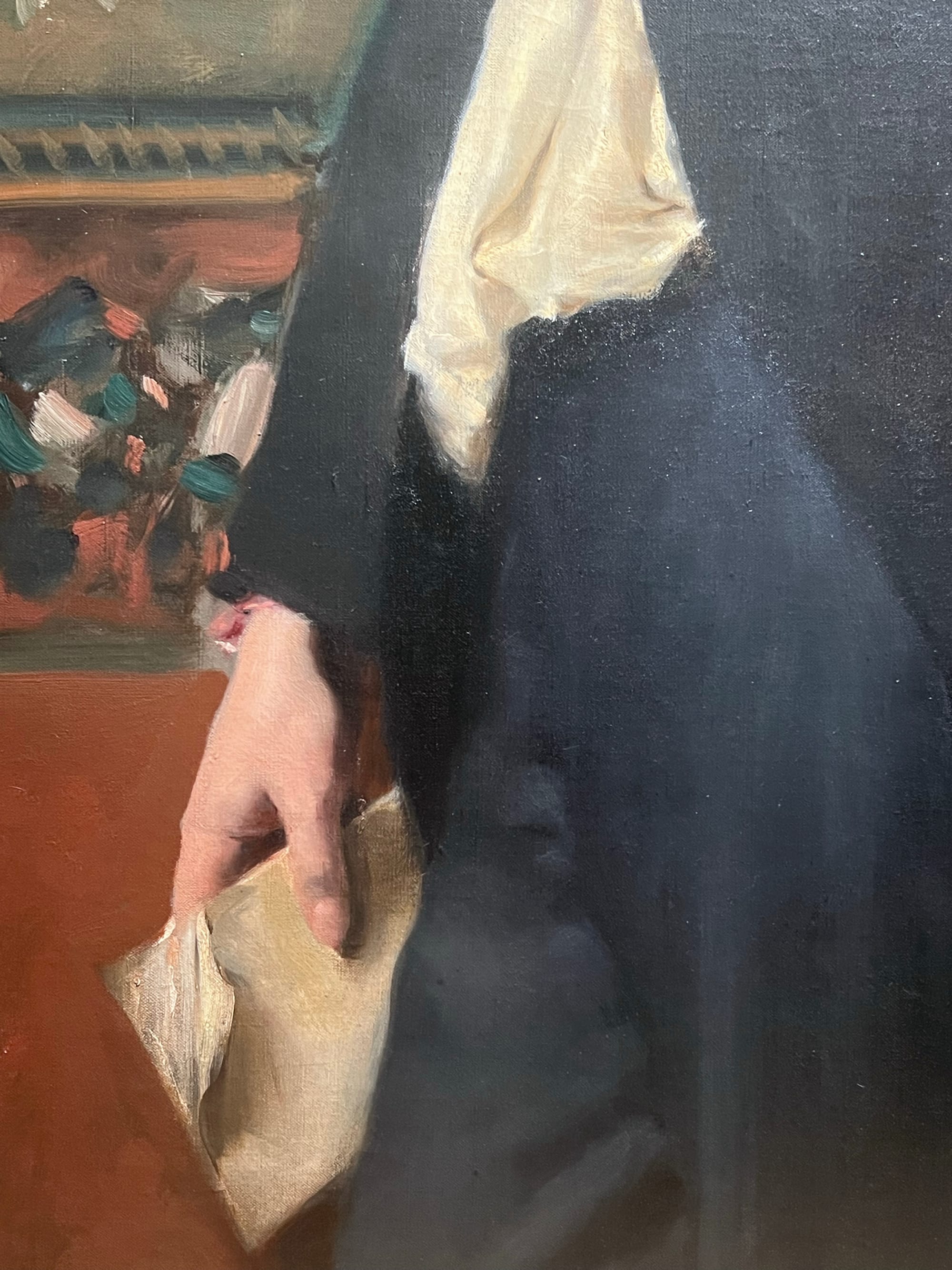 For Sargent, life is found in the hands, and he renders them better than just about anyone. See, for instance, the dashing “Dr. Pozzi at Home” (1881), enrobed in splendorous red. His right index finger and thumb clasp his garment shut while the other three fingers splay out energetically across his breast; two fingers of his other hand hang off a string at his hip. One of Madame Ramón Subercaseaux’s hands in her 1880 portrait grasp at the post of her chair, her index finger curled as if its pad were feeling its polished surface; the other is poised casually against the frame of a piano, her fingers about to slip off the keys. Here, as in all of Sargent’s portraits of high society, his sitters are surrounded by the trappings of their wealth, but not entrapped or even burdened by them, as in many other paintings showing off riches, like those by Thomas Gainsborough or Anthony van Dyck. Madame Subercaseaux’s piano is interesting only insofar as it’s scaffolding for her elegance, as is that fine silk and that gilt ring.