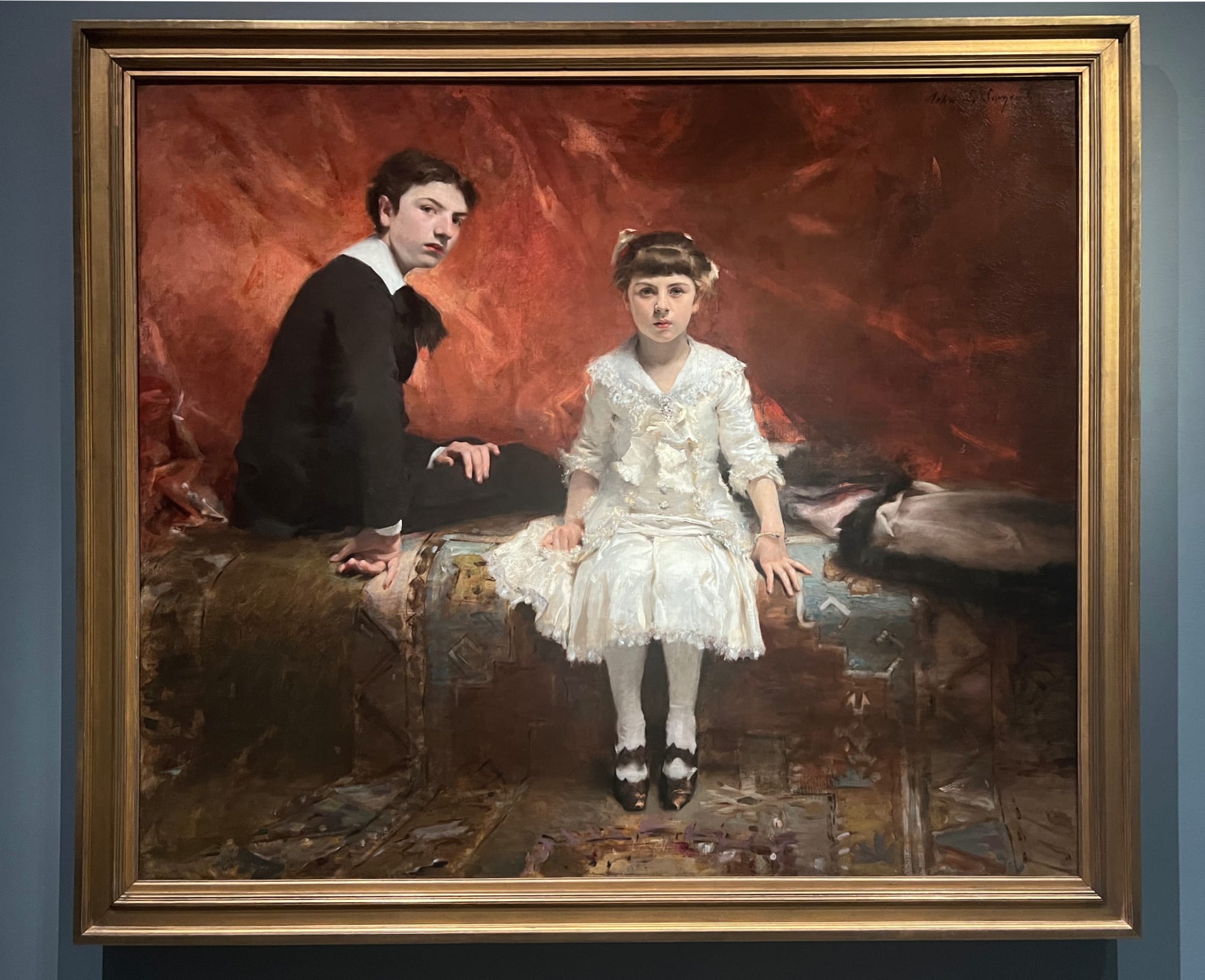 Sargent extends this grace to children as well, capturing the peculiar way that they stare, having not yet learned that it’s rude. “Edouard and Marie-Louise Pailleron” (1880) is a particularly arresting example — he apparently clashed with then-11-year-old Marie-Louise over her clothing and pose across supposedly 83 sittings, and her headstrong personality shows in her forthright gaze. Her brother’s right arm is torqued, his hand resting on its back — a favored position for Sargent, it seems — natural for its very unnaturalness. In all these portraits, the sitters’ hands emphasize their restlessness — these people aren’t trapped within this frame forever; they’re here for just a minute or two before they dash back to their own busy and interesting lives.