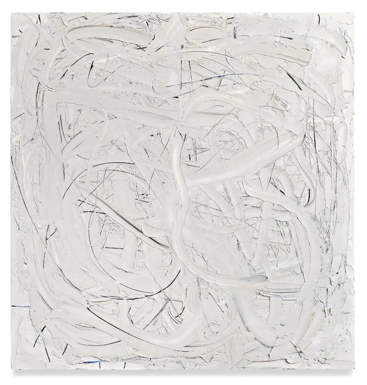 While viewers are likely to perceive the works as monochromatic, Yossifor has painted each with an undercoating of at least one color. After adding palpable layers of paint, she goes back into the surface with various instruments of different widths. Her process entails building up a painting with an impasto skin and them digging into it, caressing and scratching.