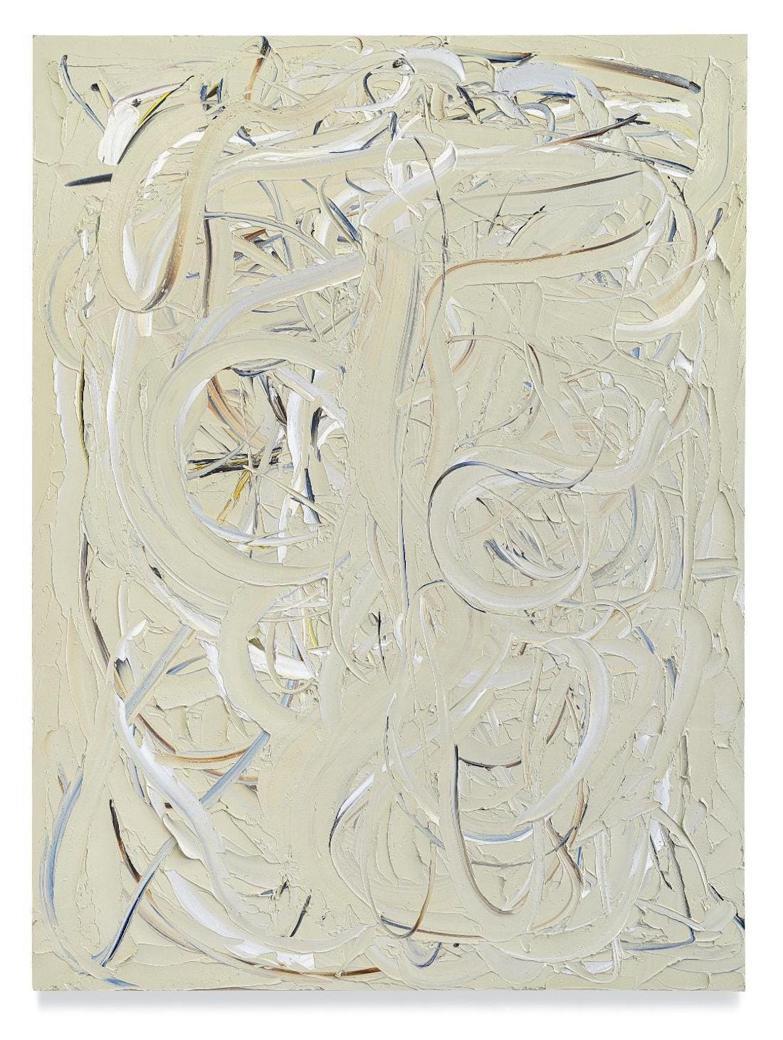 “Portrait I” (2021) reveals traces of blue, brown, white, and a bit of brownish-red in the gouges running through the paint. The gouges and swath of paint are held in check by paths of thick, creamy paint that often run parallel with the painting’s physical edges, serving as a border between what is outside and inside. Within that border, the surface becomes an interlocking, overlapping swirl of paint paths and deep gouges, a controlled series of movements that approach an ecstatic state without ever arriving at frenzied release.