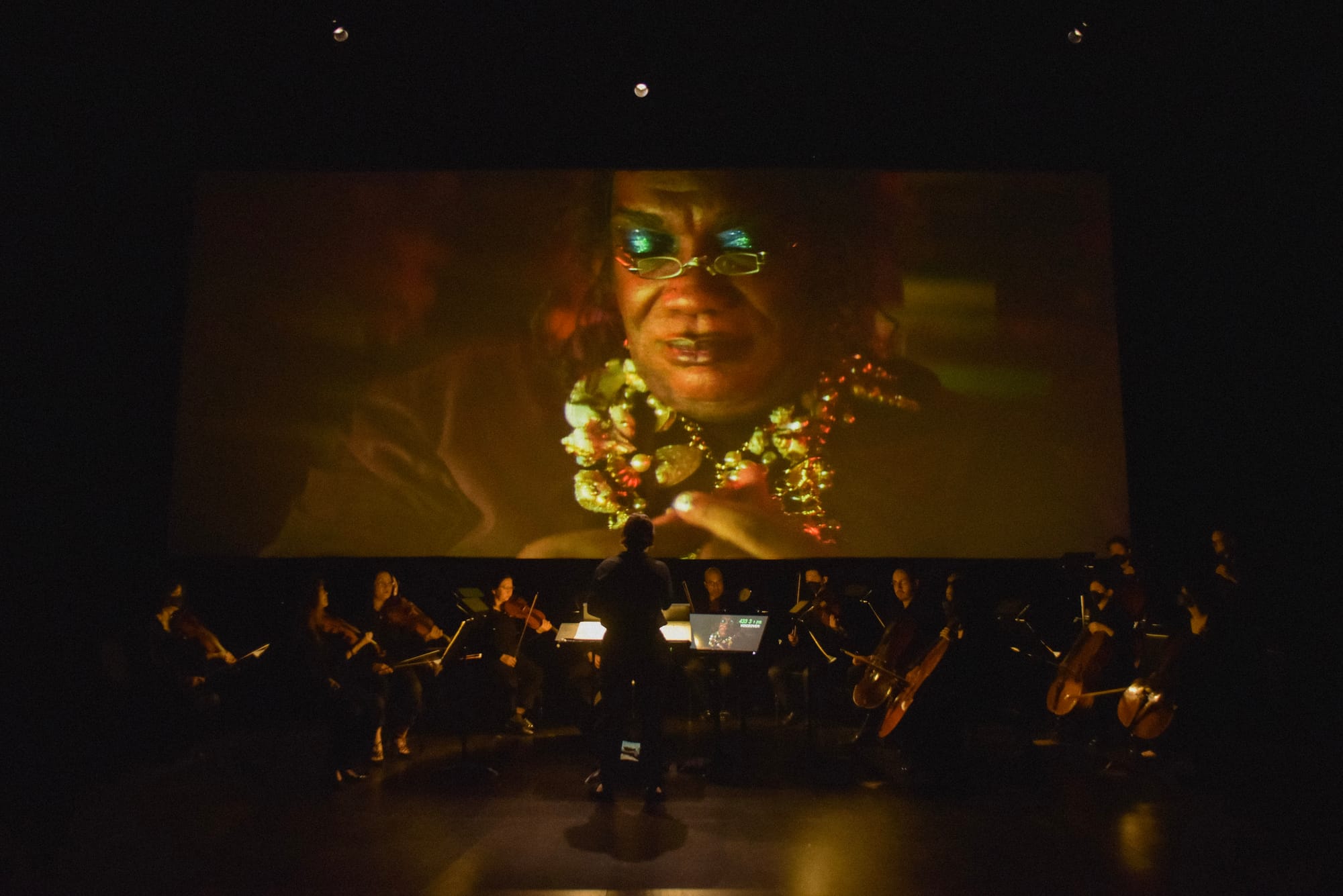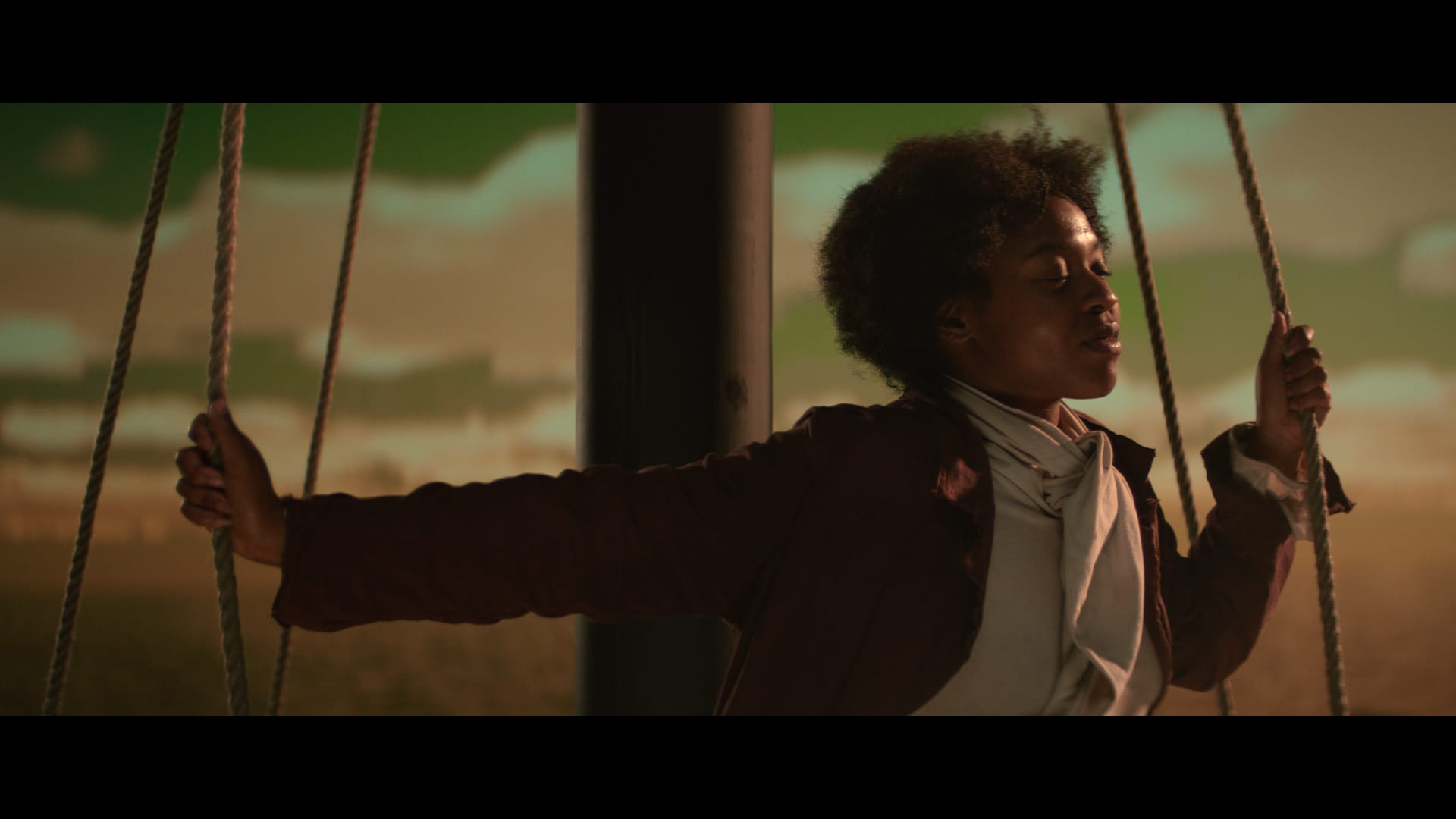 Adopting a technique historically used by silent films to stand in for spoken dialogue, MOBY DICK deploys intertitles. A musical composition by Caroline Shaw and Andrew Yee, with Asma Maroof, played by a live orchestra seated just beneath the screen, summons the orchestral accompaniment offered by early movie palaces. Even the campy overacting of the crew — which today takes on a queer valence — harks back to early American silent film, when overdoing it was a means of emoting sans sound. Tsang also deploys the early, if not quite silent-era, cinematic technique of rear projection. After a night spent in the same bed, Ishmael and Queequeg, whose implicit homoerotic relationship in the book is amplified in Tsang’s film, share a moment of queer, interracial, Marxist intimacy in front of a sepia-toned projection of a Nantucket town square; Queequeg declares tenderly: “Not you, not me. All, we.” Aboard the Pequod, a rear-projected sky meets an ersatz ocean projected by a cutting-edge virtual reality game engine, a muddying of time’s waters that underscores the film’s interpolation of past and present.