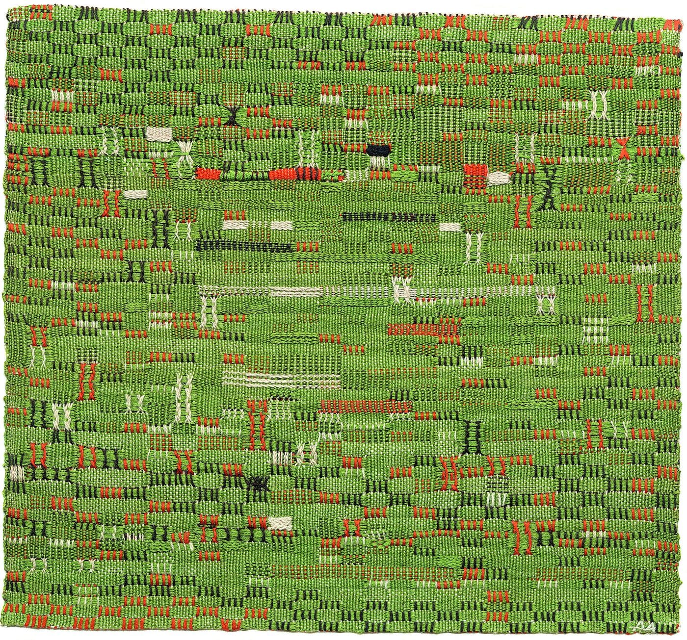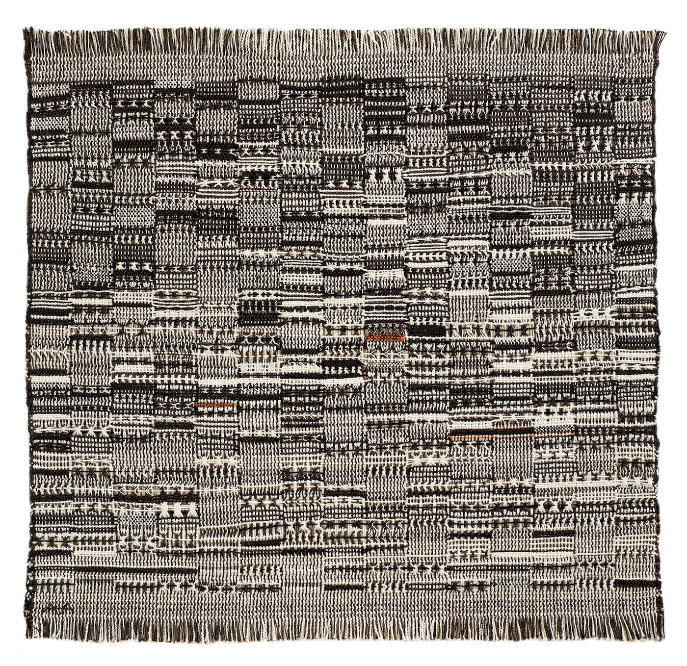 Experiencing Albers’s work up close reveals sensory details that photographs dull. The copper thread in the chenille drapery designed for the Rockefeller Guest House in 1944 — which Albers described as looking like a “potato sack” when backlit by the sun — shimmers rose-gold under the gallery lights. “Epitaph,” a tapestry from 1968 that stretches six feet up a white wall features black squiggles that evoke text and glints with gold Lurex woven alongside cotton and jute. When I glimpsed the colorful confetti of texture bursting through the black-and-white ground in “Dotted” (1959), I had to put my hands behind my back to resist reaching out and touching the puffy baubles of wool.
