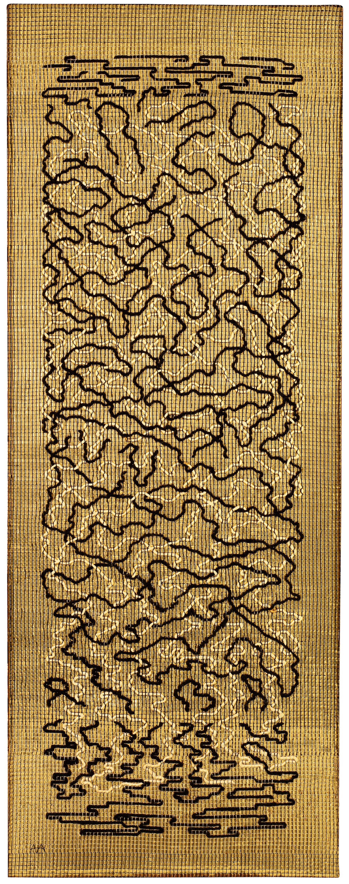 Taken together, the more than 350 works portray an artist who translated the structure and techniques of an ancient craft into a visual language wholly fresh and modern. She used modern materials and processes with an open mind, coaxing out the possibilities of a thread in innovating ways. “What I’m trying to get across,” she wrote, “is that material is a means of communication. That listening to it, not dominating it, makes us truly active, that is: to be active, be passive.” Her relentless exploration of materials and experimental samples informed her larger works and commissions. In a long glass display case of these postcard-sized samples created throughout her career — a miniature retrospective, of sorts, within the retrospective — I counted 24 different fibers, from cellophane to horsehair.