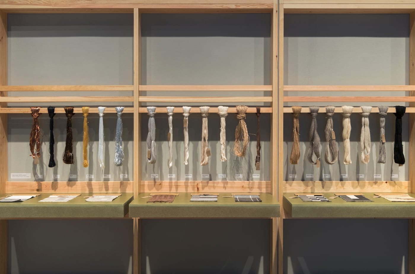 In the final section, visitors are invited to touch (finally!) hanks of spun fibers and woven samples. (I think others may have been harboring a tactile urge too, given how many people lined up to run their fingers through the threads that ran through Albers career.) “Weaving is an example of a craft which is many sided,” Albers wrote. “Besides surface qualities, such as rough and smooth, dull and shiny, hard and soft, it also includes color, and, as the dominating element, texture … Like any craft, it may end in producing useful objects, or it may rise to the level of art.”