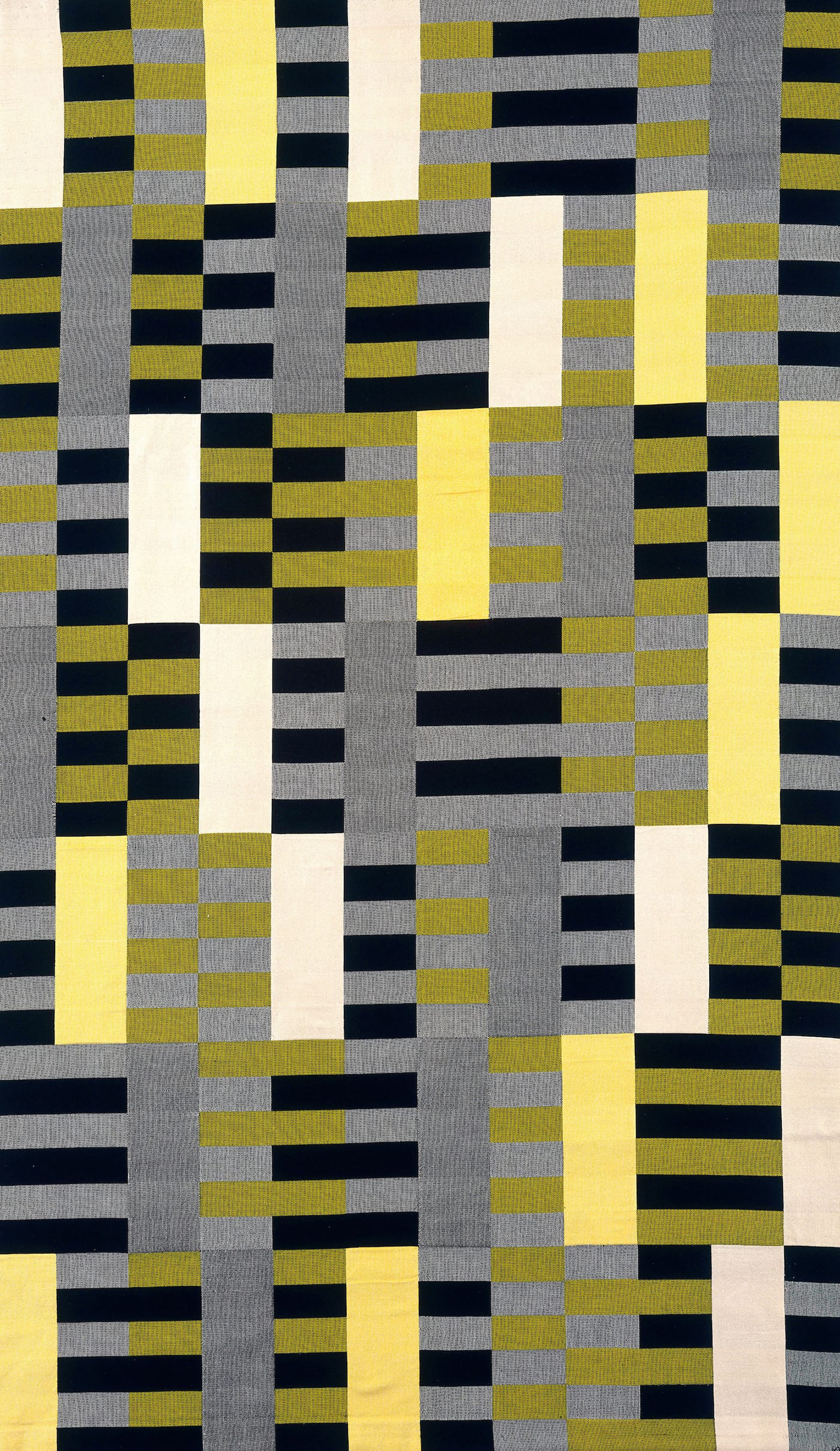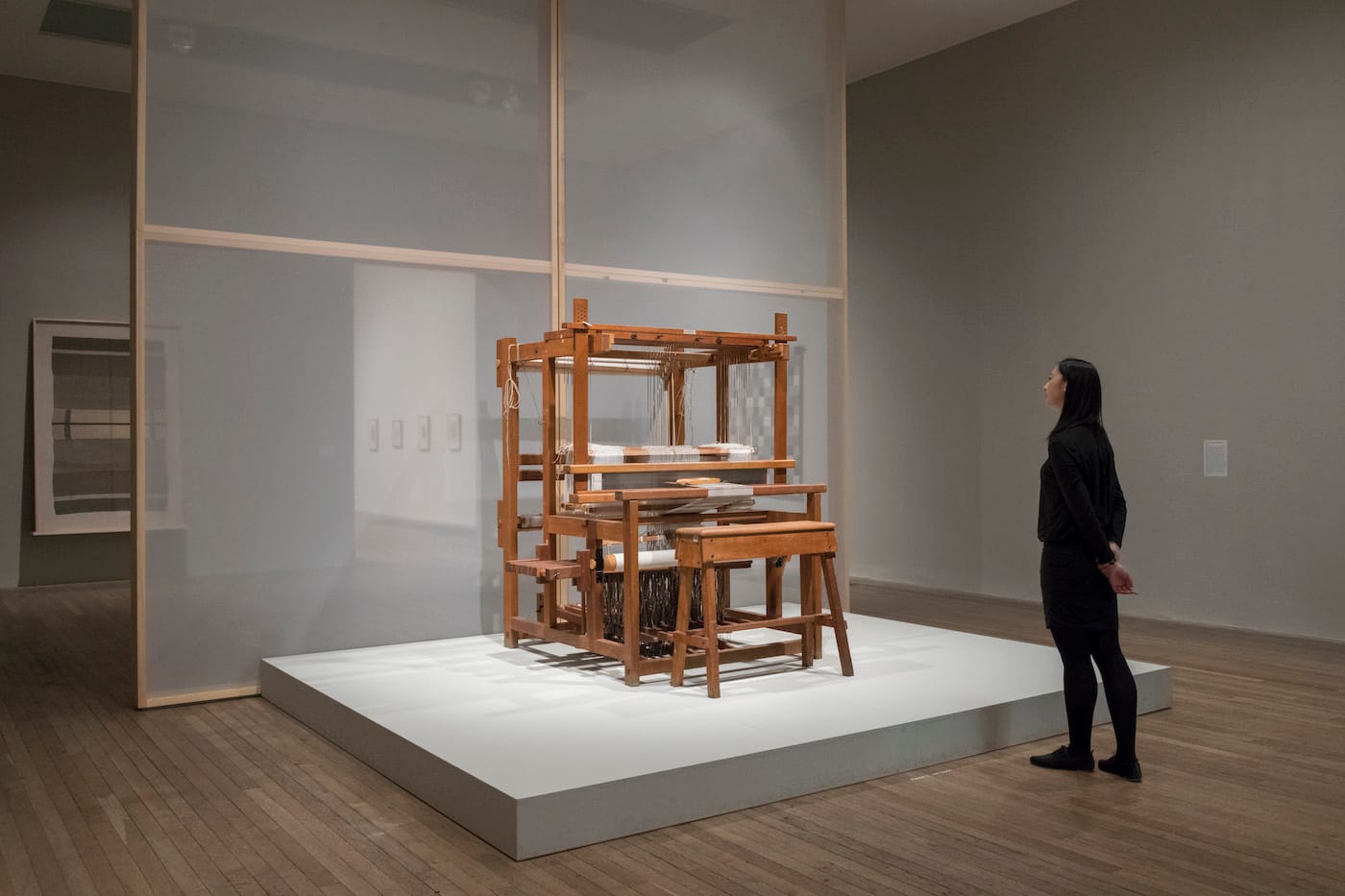 The exhibit opens in a quiet room with a wooden loom and a black-and-white photo of the Bauhaus weavers peaking mischievously through the treadles of a loom. Starting with her schooling at the Bauhaus, the show leads into Albers’s life as a teacher in her own right at the experimental Black Mountain College in North Carolina, where she headed the weaving department for more than 15 years.