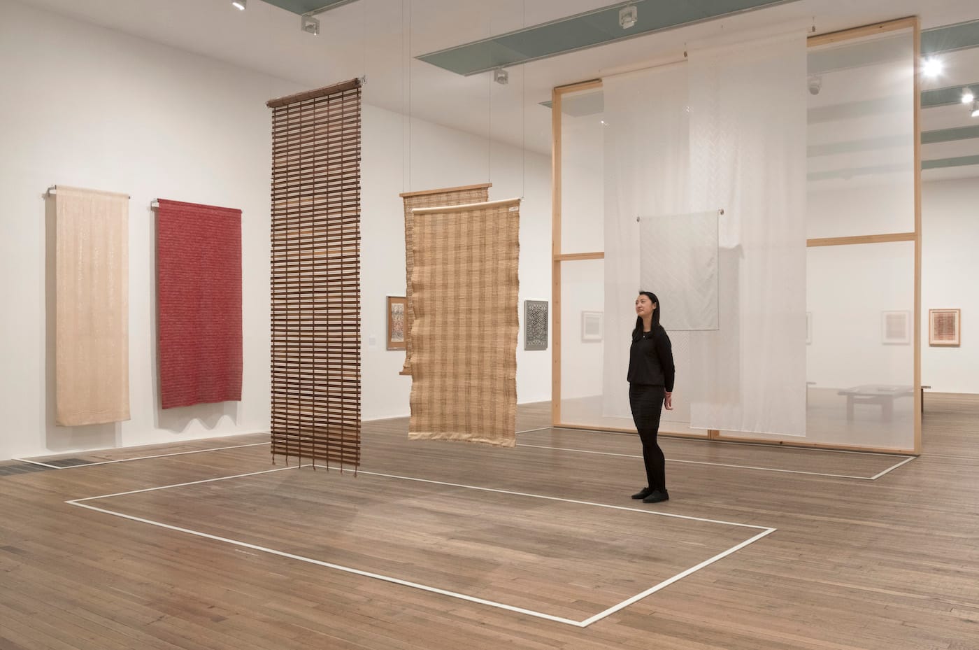 Each doorway of the exhibit is a portal into a different side of Albers’s career and identity: A consummate innovator, writer, researcher, and collector who revered Pre-Columbian textiles. She made, in her words, “pictorial weavings,” artworks meant to simply be looked at. She was commissioned to make fabric designs (some still in production today) and textile works that interacted with auditoriums, restaurants, private homes, and synagogues. Partitions made with sheer fabric are used to break up the exhibition space, summoning to mind Albers’s visions for using textile panels to divide rooms for flexibility and to reflect light — not as an afterthought or a decoration, but integral to the architecture.