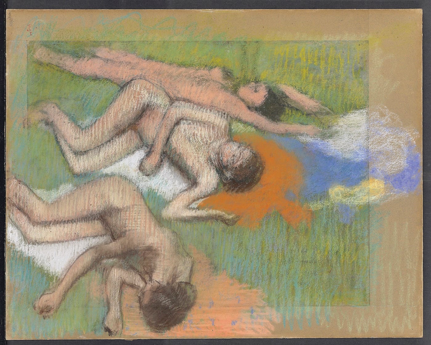 Maybe, to make another link to modernism, it’s the high pitched, cheaply decorative colors, so very Warholian!, that initially keep me from responding seriously to these Renoirs. And yet, you need only compare Cézanne’s “Three Bathers” (1879-82) or Degas’s “After the Bath, Three Nude Women” (1895), both displayed in the current show, to Renoir’s works of the same era, “Bather Arranging Her Hair” (1885), for example, to recognize the highly distinctive qualities of Renoir’s art.