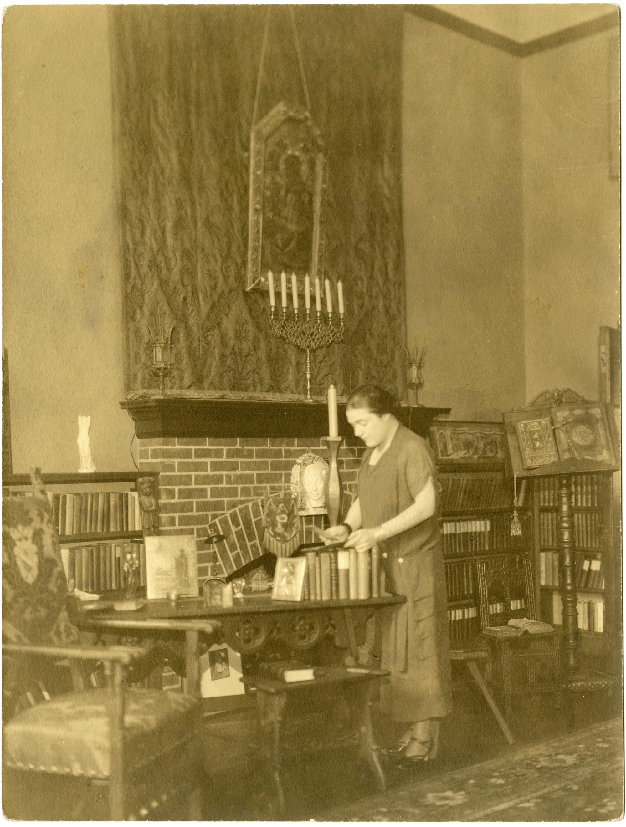A photograph in the collection of the New-York Historical Society (NYHS) depicts the Jewish American novelist and dramatist Fannie Hurst sifting through books in a room; a seven-branched menorah is prominently displayed on the mantelpiece behind her. Hurst was known for her support of social justice causes, including the rights of women, African Americans, Jewish refugees, and other oppressed groups.