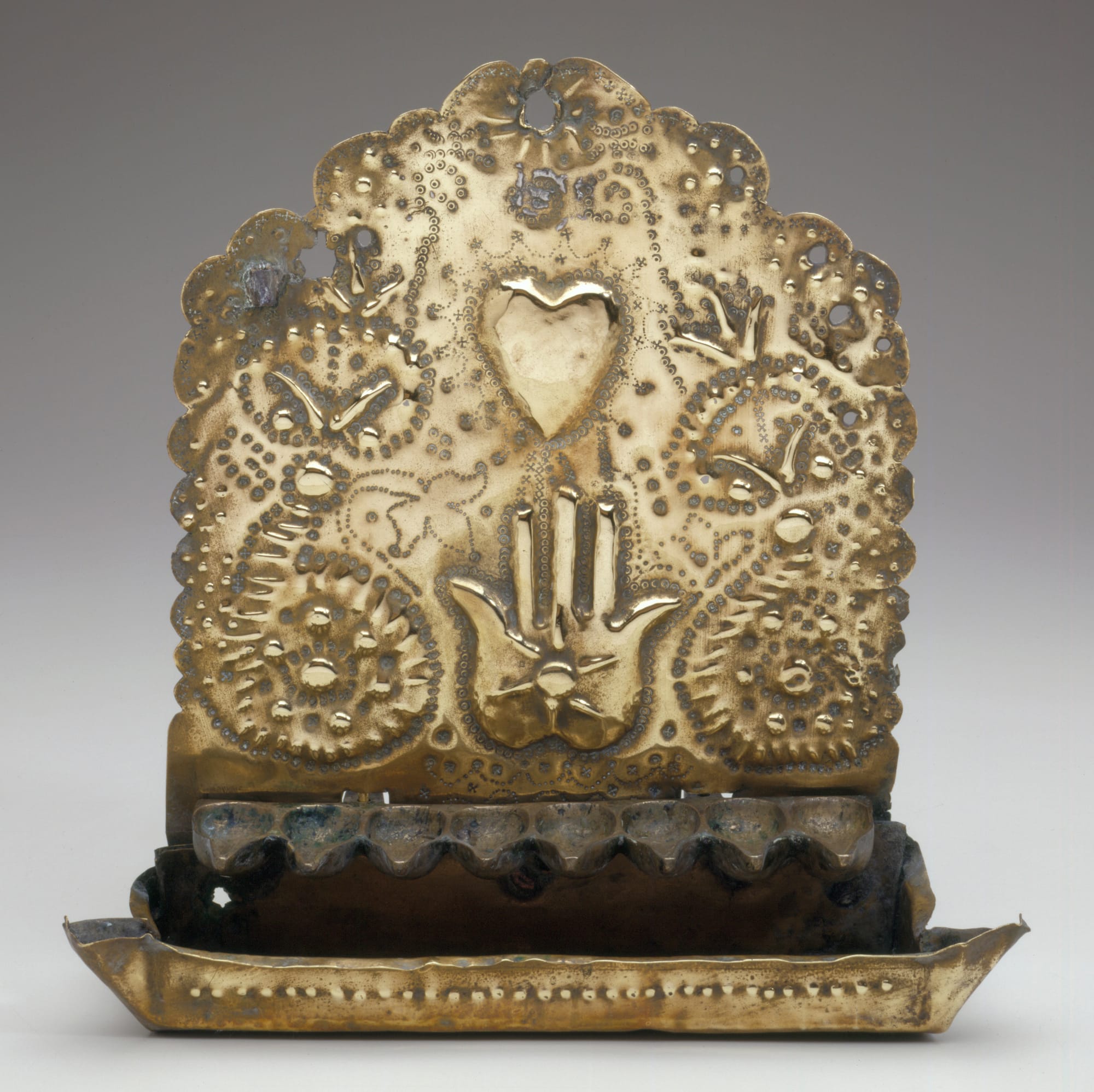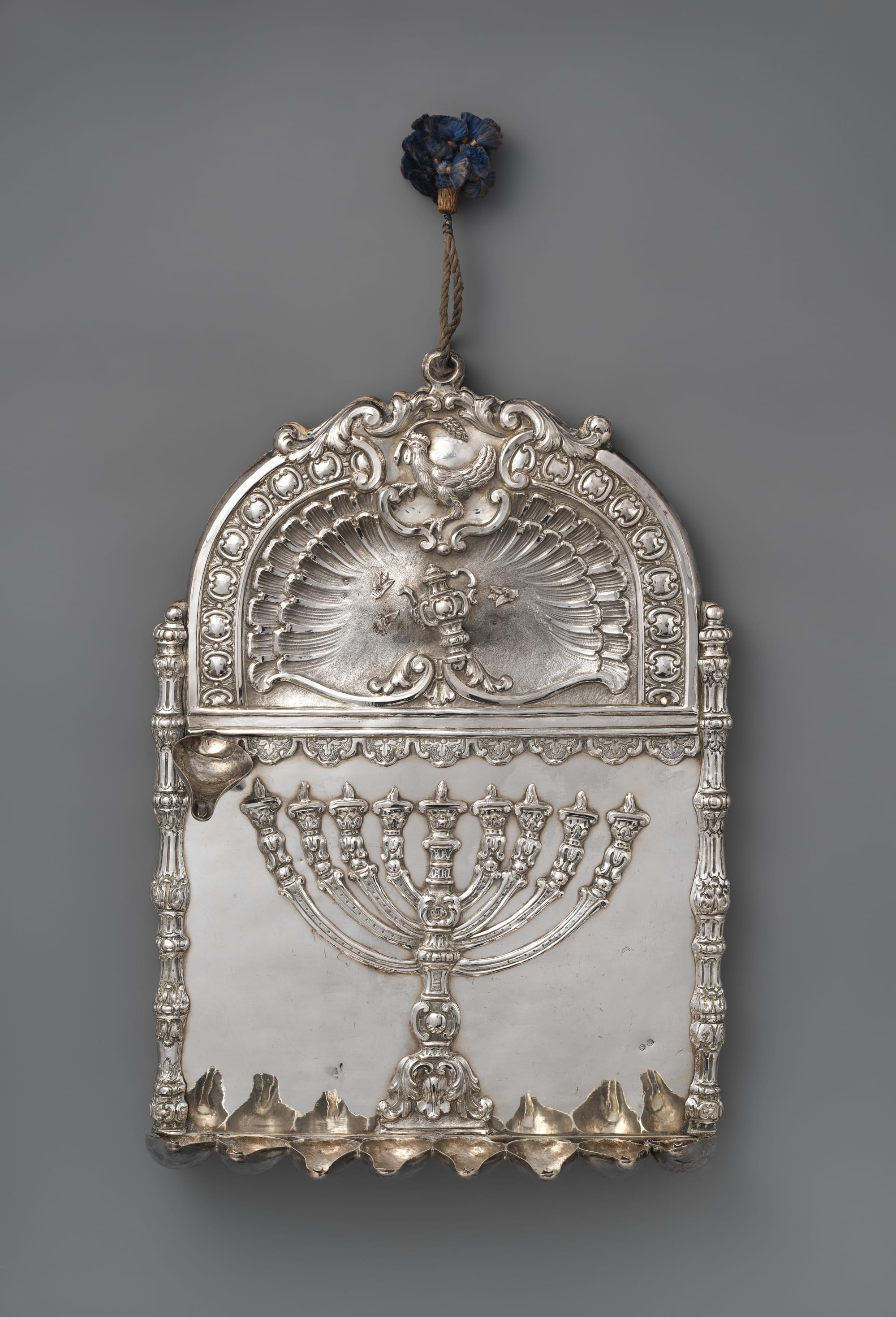 Another noteworthy Hanukkah object on view at the Met: the Baraffael lamp, a hanging wall lamp rather than a standing candelabrum. The rooster embossed in the top register is the crest of the wealthy Baraffael family in Rome, who commissioned the lamp in the 1770s, while the luxurious stylized shell motifs evoke the Rococo style popular at the time.