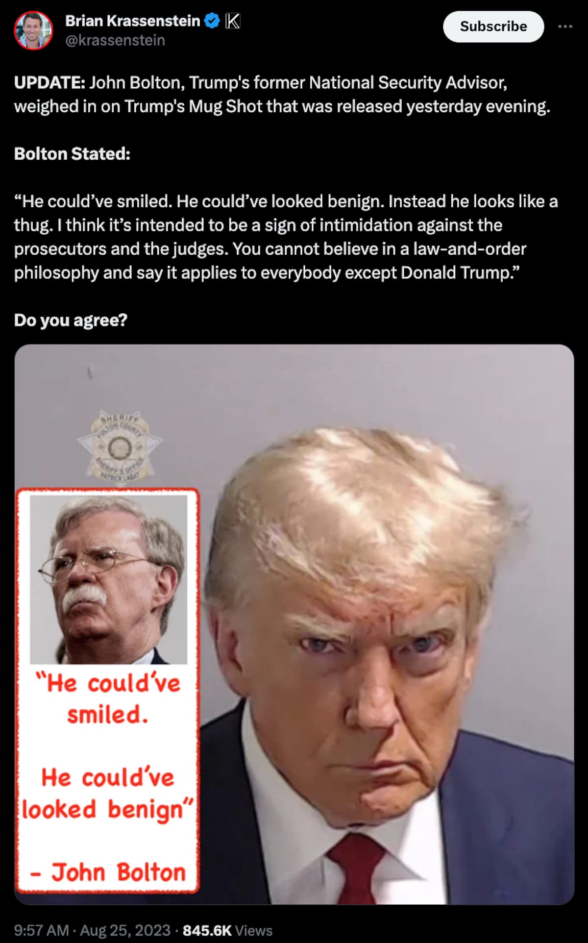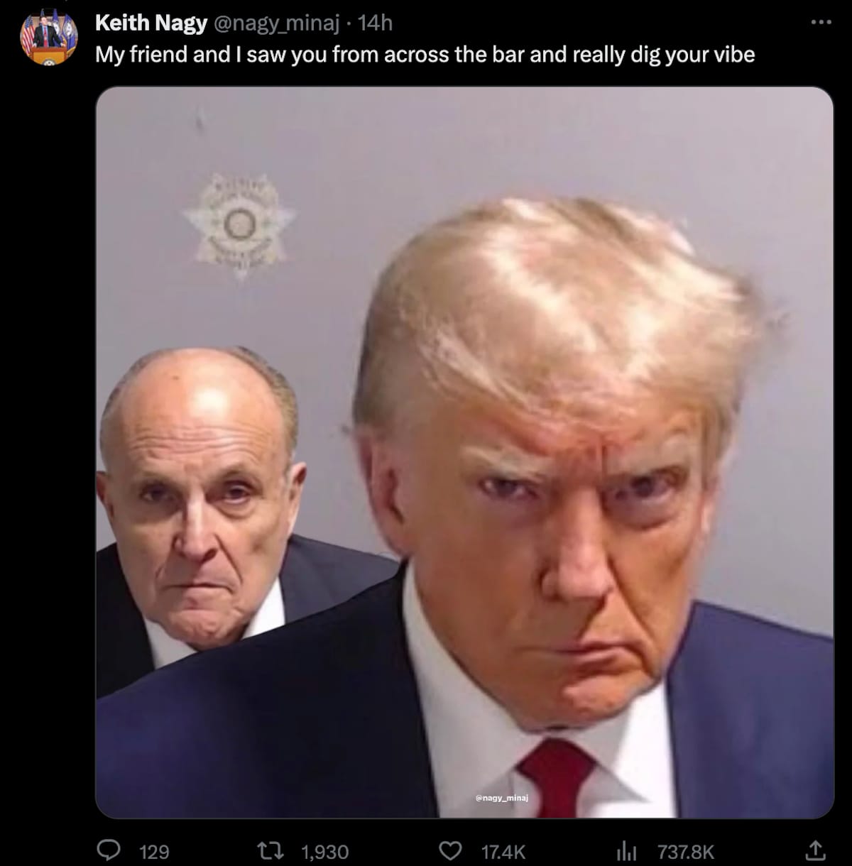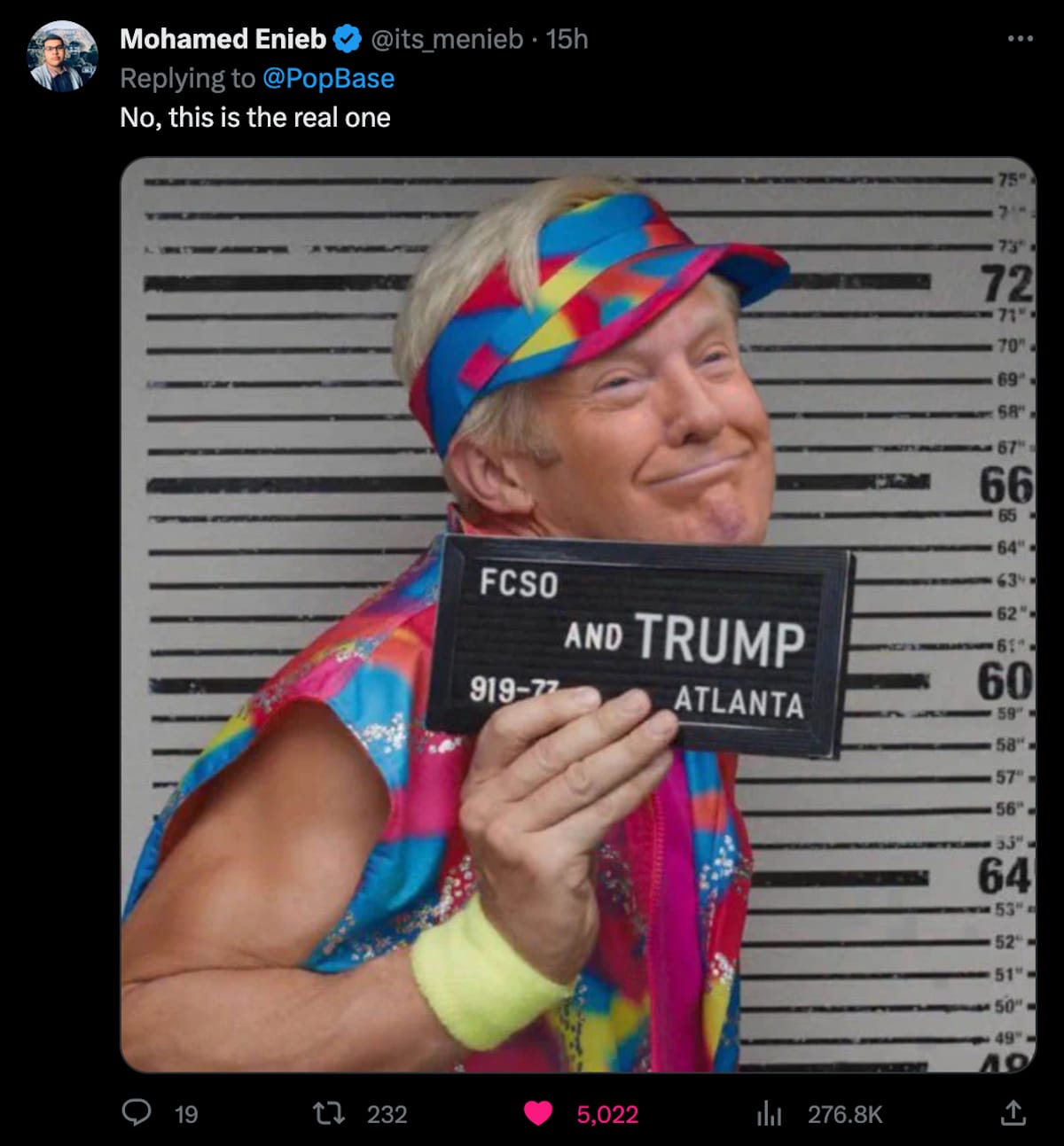 And in a moment of seriousness to punctuate this round-up of repostable memes and talking points, we must remind you that Fulton County Jail is currently being investigated for severe overcrowding, rampant bedbug infestations, and six inmate deaths in 2023 alone while a vast majority of inmates have yet to be tried or cannot afford to post bail. The former president was in and out of the jail within 20 minutes, but the rest of the prisoners, 87% of whom are Black, are being held indefinitely in inhumane if not deadly conditions.