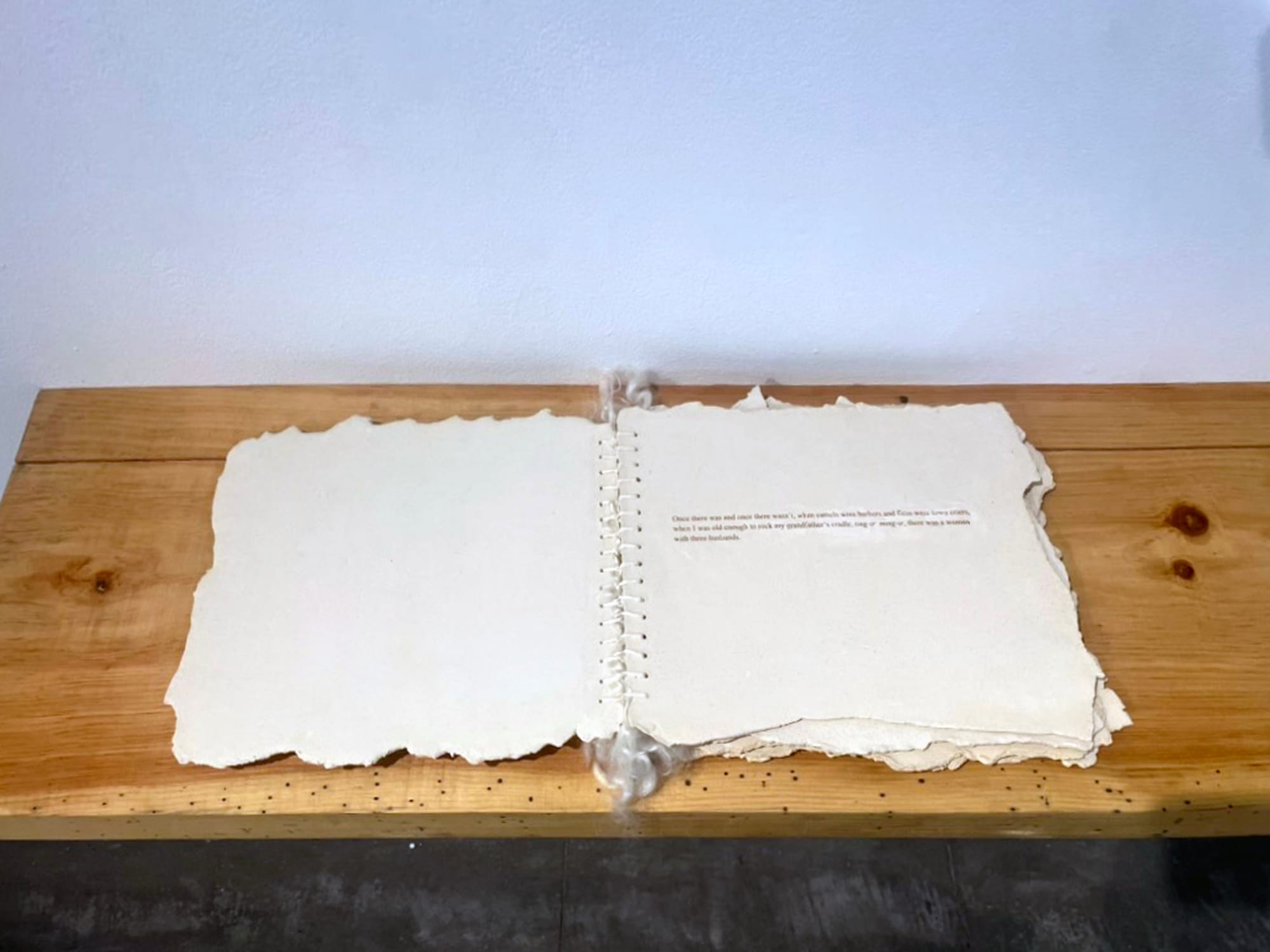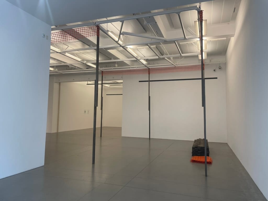 Installations on view turn galleries into would-be campsites, erecting makeshift structures across their barren white boxes. Ayla Gizlice’s “Rumble, Rumble, Rumble” (all works 2025) cordons off one gallery with strings stretched from floor to ceiling, wrapped around a wrought iron bar. Beyond it lies what looks like a tea kettle and floor cushions, waiting for guests who haven’t yet arrived. Harrison Kinnane Smith’s exhibition uses scaffolding wrapped with orange plastic fencing to frame its contents, stacking wooden boards along one wall to evoke a half-finished construction project (“Story Poles (Proposal for New Wight Gallery)”). Each installation is in conversation with other artwork on view: Smith’s photography investigates LA housing developments, and Gizlice’s exhibition includes an original fairytale — the kind one might tell around a campfire (“The Woman with Three Husbands”).
