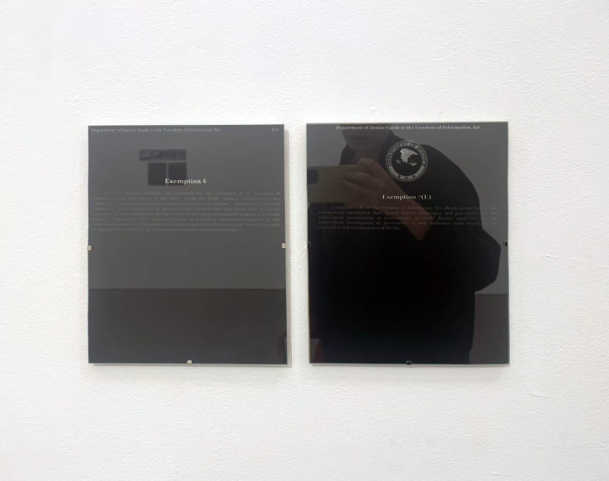 Student sculpture, photography, and video interrogate art world conventions, poking fun at the ways artwork — and life — are traditionally experienced. Maren Karlson’s grayscale paintings and collages lie on the floor under a glass pane. Their display mimics how one might study her subject matter, which ranges from machines to X-rays of her own organs. In Zenobia’s “ ‘Why allow the tendrils of the heart to twine around objects (abject) – for Harriet Jacobs,’” an enlarged steel needle appears to pierce directly through a gallery wall, ominously positioned at head-height. D.A. Gonzales exploits barriers in “CBP-FO-2024-133704,” a series of 21 reflective graphite prints that reveal FBI denials of requests for video footage from surveillance cameras at the United States-Mexico border. And Misty EunJoo Choi demonstrates how domestic life interpolates art, often to surreal results: One video and accompanying installation features a small kitchen vestibule tipped on its side, the footage capturing warped daily rituals: Toast flies “up” to a plate, and a figure crouches from the “ceiling” (“The Disoriented Room”).