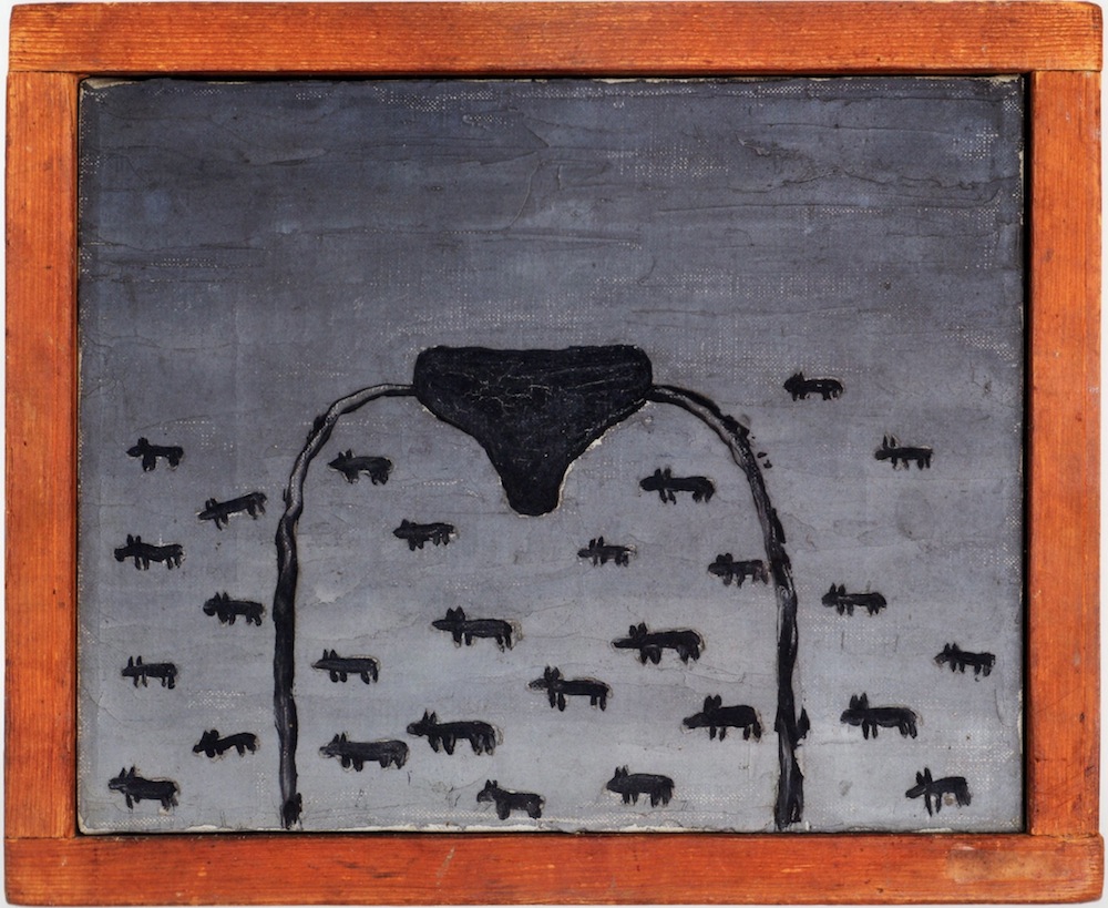 His paintings are small windows into worlds that occupy the territory between awake and dreaming. “Untitled (No. 31)” (1951) harkens most explicitly to this idea, with many tiny sheep-like creatures set against an ominous grey sky alongside an abstract, black structure. In all of Bess’s work, paint is manipulated to elicit a range of textures — from the thin layers through which raw canvas peaks out, to the course gritty surfaces of works like “Untitled (The Spider)” (1970) — lending each imaginative vision a sense of materiality and weight. The mysterious, yet vaguely familiar, forms of “Before Man” (1952-53) illustrate Bess’s interest in primordial symbols; one further manifestation of the artist’s belief in the unifying and universal forces of art.