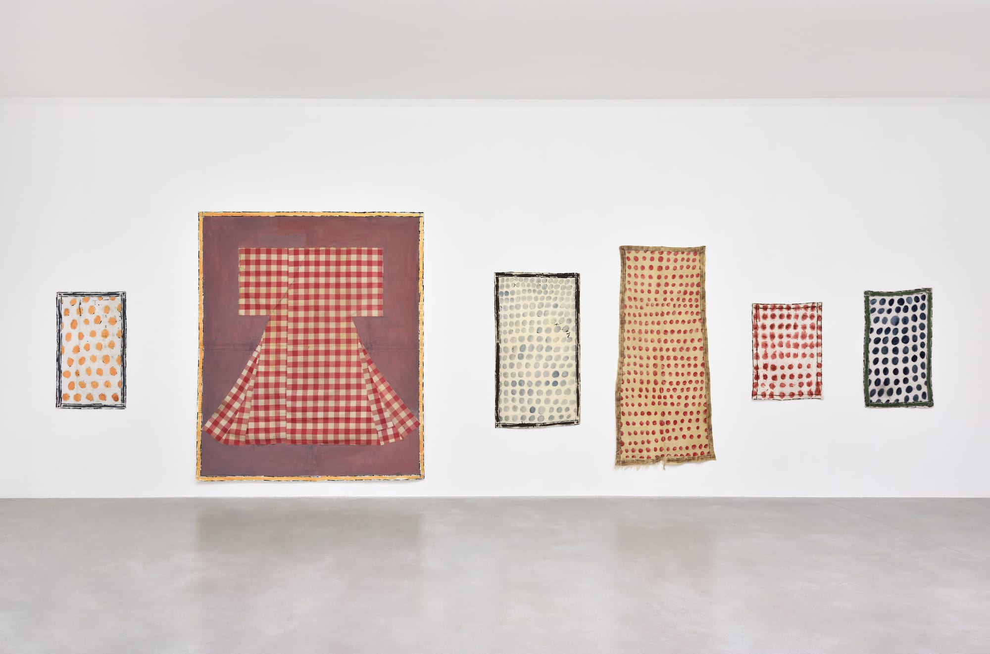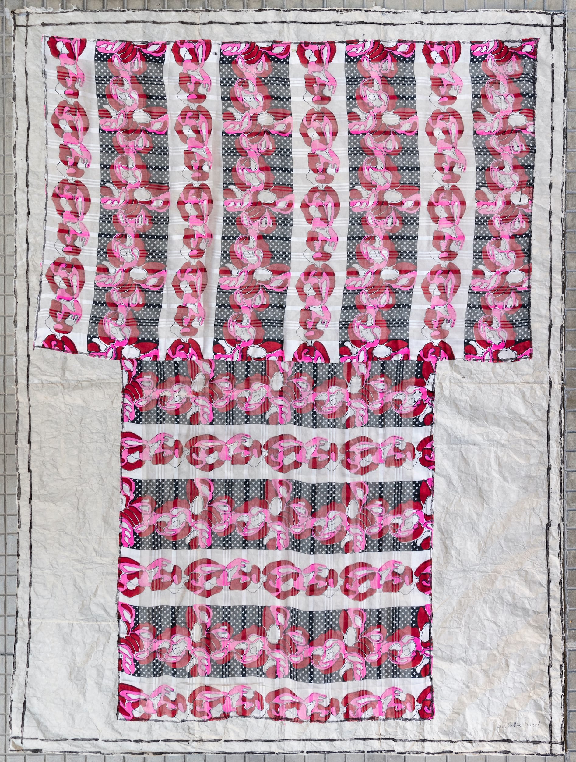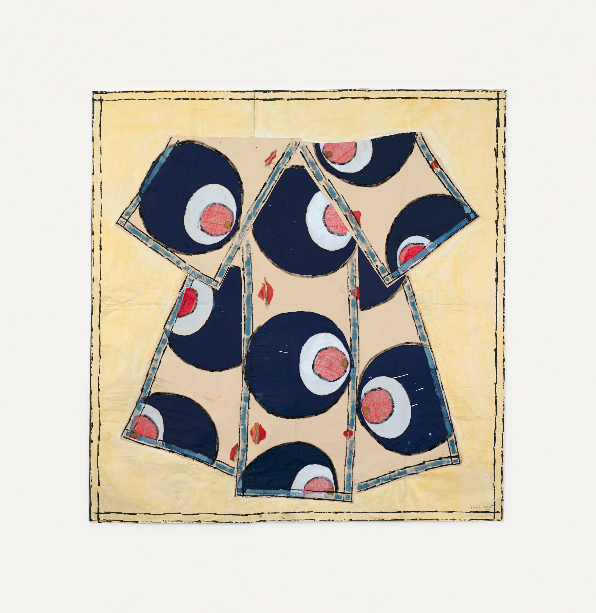 Hung unframed on the walls, large-scale tapestries depict oversize garments reminiscent of kimonos, but simplified in shape, sometimes mere swathes of brocade or checkered fabric arranged in a cloak-like form. From a distance these cloaks appear to be cartoonish sketches or gestures emphasizing line and color, but up close their details become mesmerizingly complex. The lengths of fabrics, some of them stained or frayed from use, are collaged in ways that draw the viewer into an intricate topography of texture, line, and layers. Meticulous rows of even hand stitching (apparently still done by the nonagenarian herself) not only bind the layers of cloth together, but also become their own subtle form of mark making. Framing the shapes, and often the works as a whole, are broken (out)lines, boundaries of frames filled in or offset by mostly saturated, deep colors painted on the background canvases. Checkered cloths punctuate the scenario, and every so often, the artist paints a grid where none appears in her found materials.