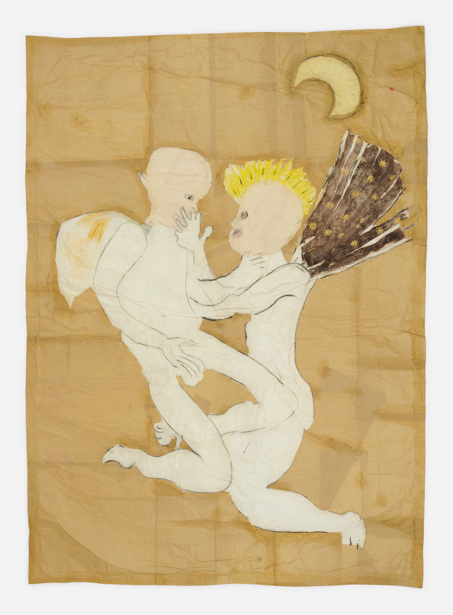 In the show’s smaller fabric pieces, Ducrot paints repeating shapes (among them, dots and concentric circles), draws, collages materials like newsprint or handwritten script, or repeats handwritten words (“oh!” or “surprise”) on swaths of fabric, while in her works on paper, she turns back to figuration: In a numbered series from 2021 titled Tendernesses, lovers appearing in outline embrace in various lighthearted entanglements. Additional renderings of floral arrangements, teacups, pots, and other domestic accoutrements find beauty in banality. Motifs recur across works — an upside-down crescent moon appears over and over, as do background dots. Most works in the exhibition were created in the past five years, three of them made especially for this show — a floral bouquet in “Surprise” (2024) is a burst of exuberant color whose cutout shapes recall those of Henri Matisse. (Other works from the same series are on view through August 17 at Sadie Coles HQ in London, as part of her exhibition Remembering Flowers.)