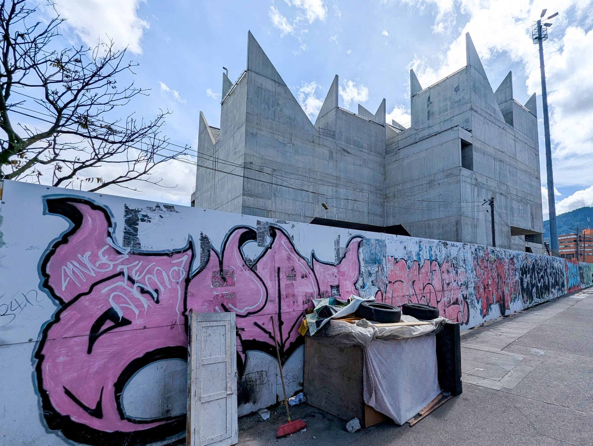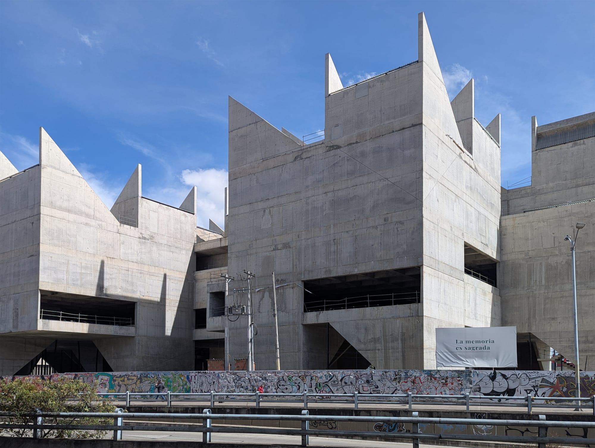 A white banner currently hangs outside the museum that reads “la memoria es sagrada” — “memory is sacred.” Nearby, the temporary walls surrounding the abandoned construction site have been covered with graffiti and tags. As soon as the building is inaugurated, it too will most likely be used as a surface for images and texts, which is not necessarily a bad thing. The artwork and writing on the walls throughout cities in Colombia have always been a much more reliable source of information than the mainstream media regarding the armed conflict, serving as some of the only written testimonies of all those who have been disappeared.