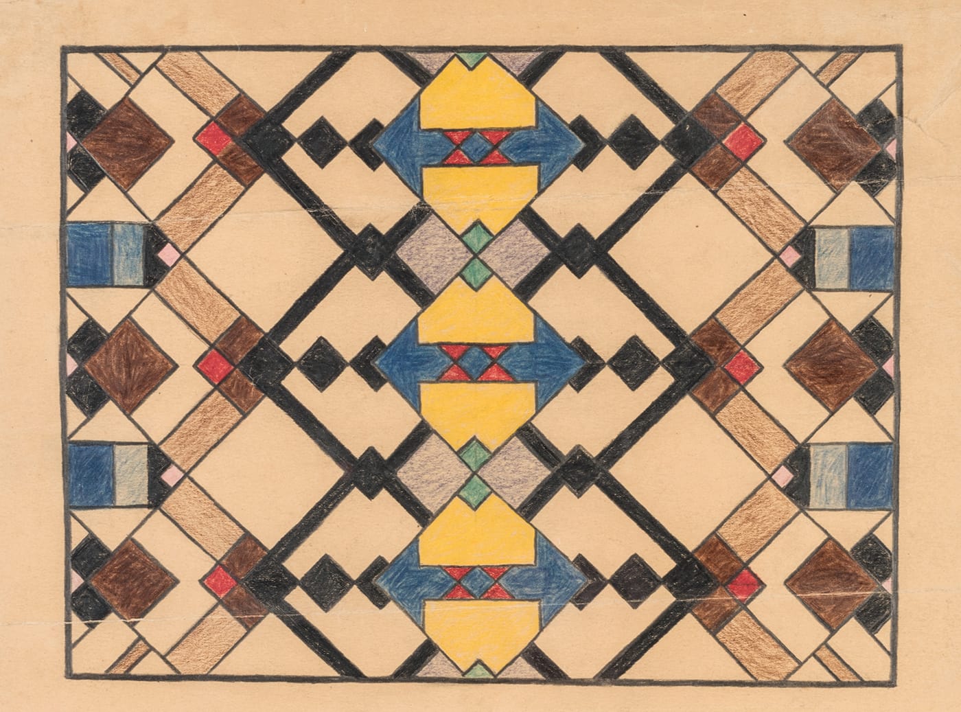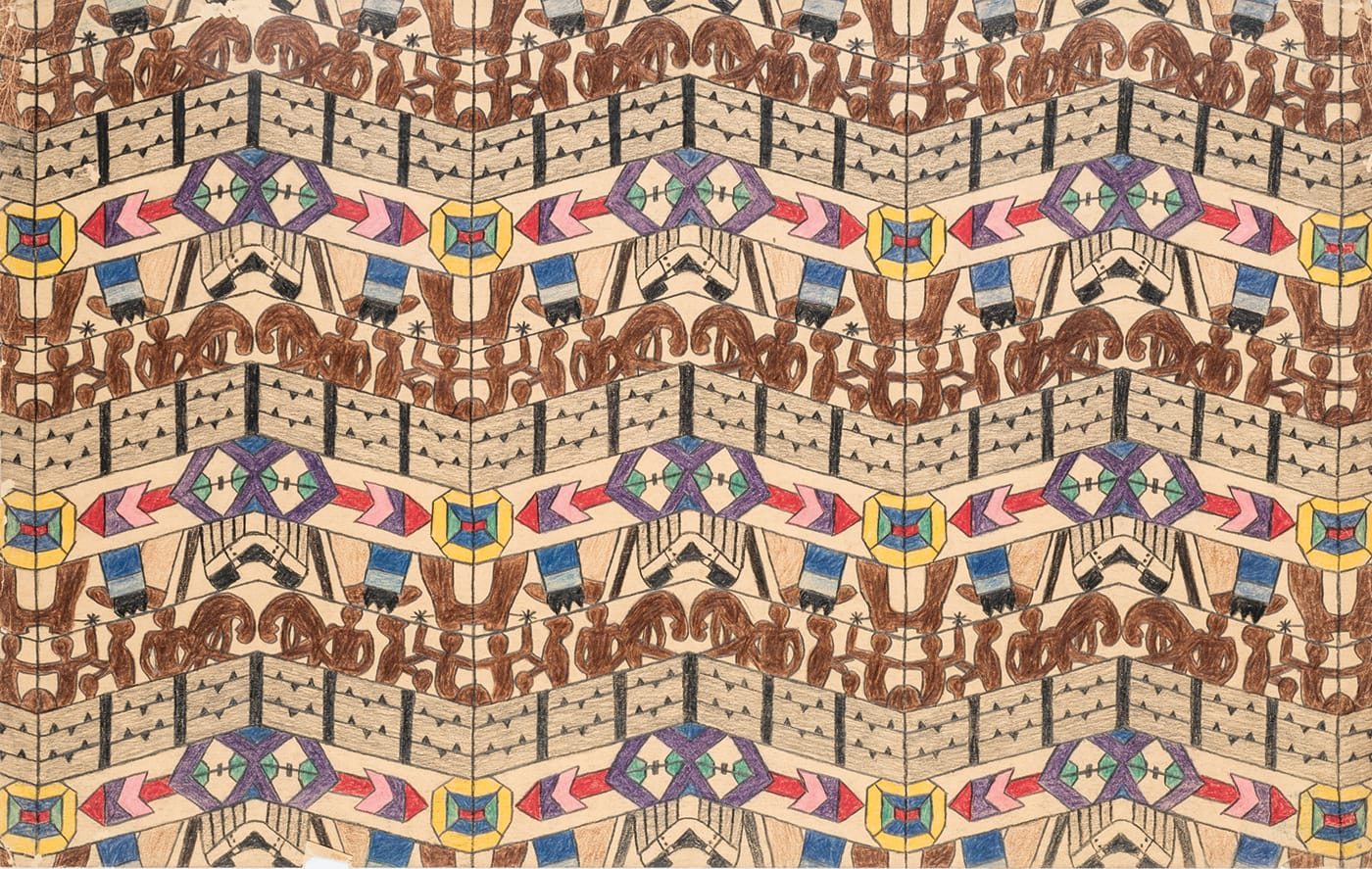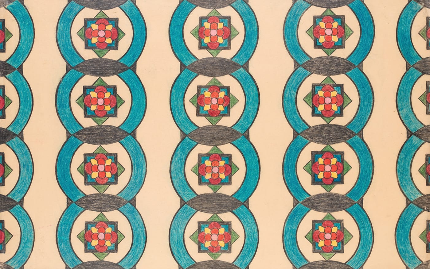 “Let us return to the moment when many Indian people, like Mary Sully, staked a native claim to modernism,” Deloria writes, placing his great aunt’s work alongside Kiowa artist Stephen Mopope’s “Kiowa Warrior on Horseback” (1928-29) and Pueblo artist Awa Tsireh’s “Mounted Warriors” (1925-30). The latter two works feature detailed depictions of Indian men arrayed with traditional accessories — bows, shields, buckskin, and feathers — on horseback against spare, monochrome backgrounds. By contrast, Sully’s work “Helen Willis” (ca. 1929), which refers to a rising tennis star of the era, does not directly represent either her heritage or her subject, but rather presents a blend of both. An abstract with subtly representational elements, it is rendered in the colored pencils that were Sully’s signature medium. The picture plane is dominated by a kidney bean shape that roughly suggests an old-fashioned painter’s palette, but where one would expect to find blobs of paint there are five tri-colored geometric rosettes. An inset kidney bean shape in the palette’s center contains a field of cross-hatched lines that resemble the mesh of a tennis racket; the background of the image behind the larger bean has the same mesh in larger gauge. Beneath this center point, four intersecting red and brown points frame what looks like a decorative stand or, maybe, a trophy base. Nothing is directly identifiable, but it all alludes to the nature of both the subject and the artist.