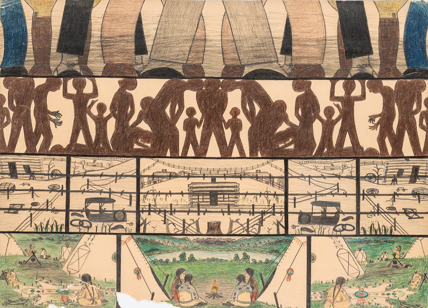 The top panel of “Three Stages” contains four horizontal strips of figurative images, all mirrored from the center out: the legs of various people; brown figures in silhouette seemingly expressing despair and existential wondering; a frontier wasteland, segmented by fences and littered with broken wagon wheels; and a bucolic scene of native people sitting on grass around fires and near teepees. The middle panel abstracts elements from the first panel into fluid, rolling strips of barbed wire, anguished figures, boots, log cabins, and geometric regalia. The smaller bottom panel is entirely geometric, with a central pillar of colorful diamonds fracturing out into black, browns, and reds — like an earthier take on Mondrian. Deloria charts this progression as loosely representing “a time of goodness, followed by unhappiness, and then uncertainty.” Indeed, Sully’s ability to break daily life into representative objects and gestures, and then further transmute those into dynamic motifs is impressive — reminiscent of artist Diane Simpson’s translation of the personal and domestic into works that can be decorative and universal as well as specific and instructional.