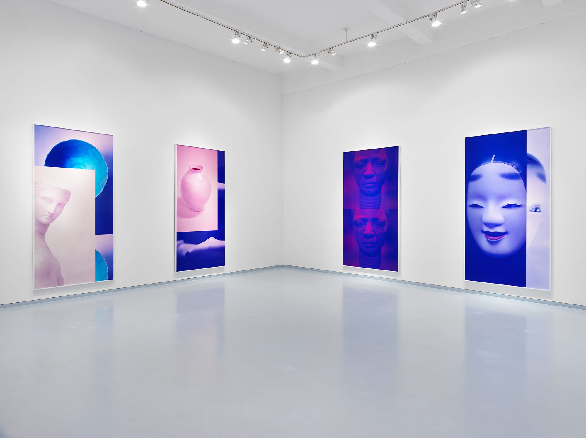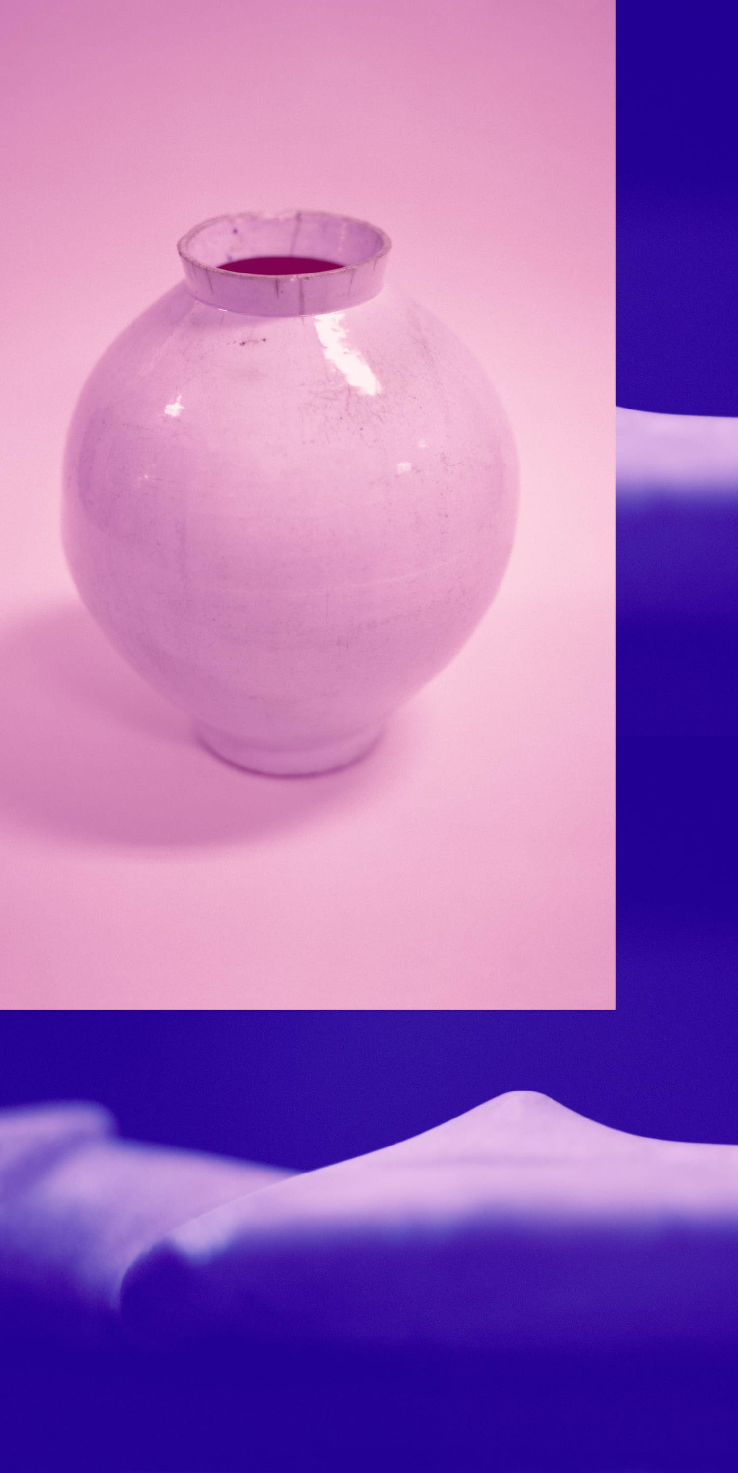 “Women & Museums II” (all works 2019) is especially filmic in this way. The color palette is her characteristic CMYK; soft pinks, purples, and blues tint each photograph of the objects (this palette is consistent across all six works in the show). A pink rectangular image of a round ceramic vase is in the top left, photographed in the style of a studio portrait against a plain backdrop with a dark drop shadow. This is superimposed over an expansive dark purple space above what resembles the chest of a supine woman, but is more likely folded fabric, or the edge of a statue. Dramatic lighting and color contrast, coupled with the unfamiliar object in the lower half of the image, create an eerie quality and a heightened sense of duration between the two images.