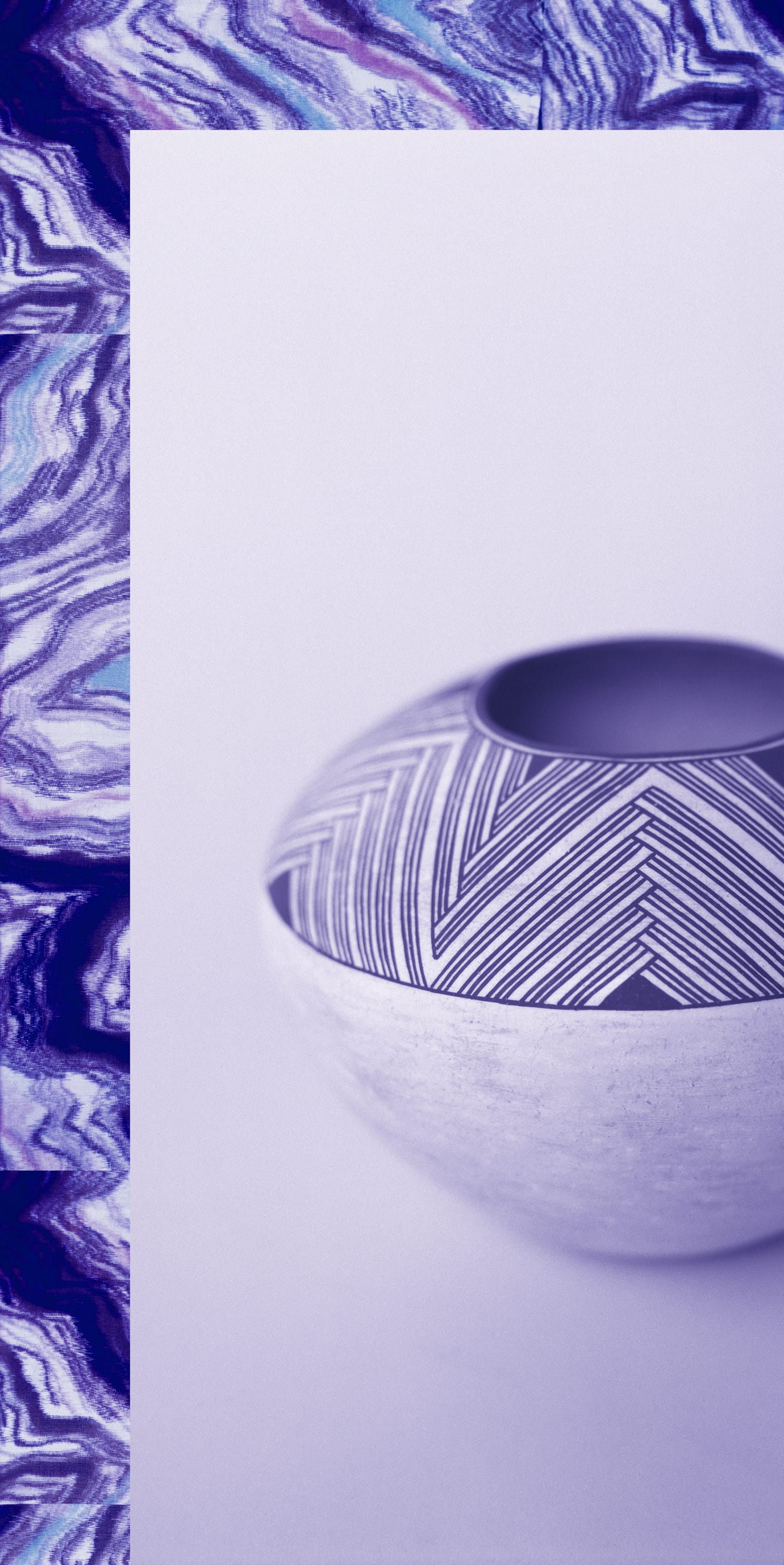 “Women & Museums V” involves a similar method of abstraction: a photograph of a patterned vase is layered atop one of a marble surface. According to the press release, the background image shows a detail of a Japanese Meisen kimono and the vase is from the late 1960s by New Mexico-based artist Lucy M. Lewis, a mother of nine whose practice recreated ancient patterns on ceramics. The abstraction created by the layered images dislocates each object from its place in history, while simultaneously giving them an unusual amount of physical space and attention, demanding we view them as artistic objects with aesthetic properties beyond their use-value or craft status. Even without the knowledge that one of the works was created by a mother, textiles, ceramics, and other domestic arts are often made by women at home whose additional jobs include taking care of children and elders, labor that is not highly valued in our culture, and many others.