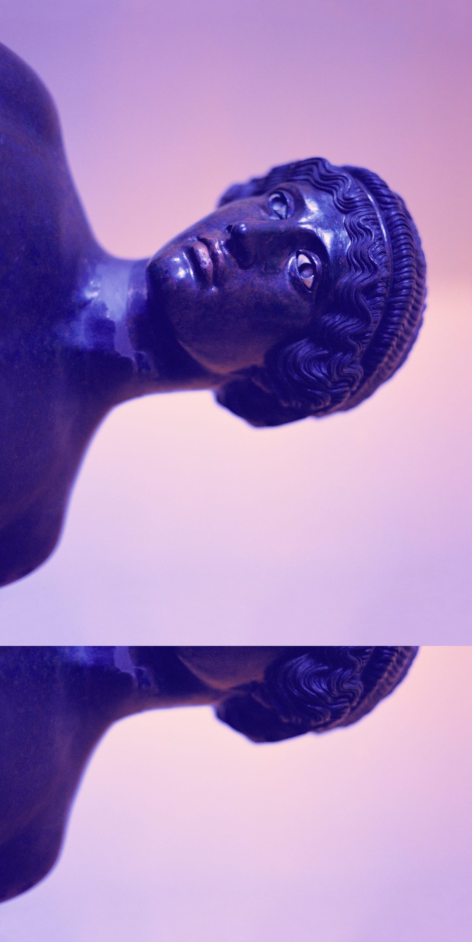 The series is displayed in a small room and is comprised of only six works, each nearly eight feet tall. They tower over viewers, with objects enlarged far beyond actual size. This magnification also heightens the viewer’s aesthetic experience of both the works photographed and VanDerBeek’s compositions, and brings the scale closer to that of the body, recalling the physicality of sculpture. Up close, the images are slightly grainy, giving them a tactile quality in addition to the glossiness bestowed by the artificial coloring. But the objects retain something of their status as historical markers and archeological relics. “Women & Museums VI” shows the head of an ancient statue of a woman rotated sideways, eyes and lips tinted with traces of paint. In this work, the photograph of the head overlays and partially covers the same image, like a looped film strip; the figure gazes upward into the distance. The paint remnants are a reminder of the statue’s age and wear.
