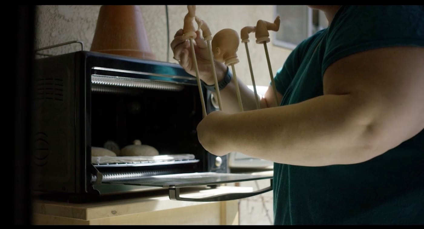 “Dollhouse,” a short film by LA-based director duo Terri Timely, follows Charles’s practice of “Reborning,” as hyper-realistic doll-making is known. Like most Reborners, Charles considers herself an artist, not a craftsperson. The labor-intensive process of making a Reborn doll can sometimes take weeks. In the seven-minute film, we see it unfold step-by-step: Charles stabs tiny hair-holes into the scalp of a doll head with an awl; removes painted doll limbs from a toaster oven and places them on sticks to dry; and swaddles a Reborn baby in bubble wrap before shipping it off in a cardboard box.