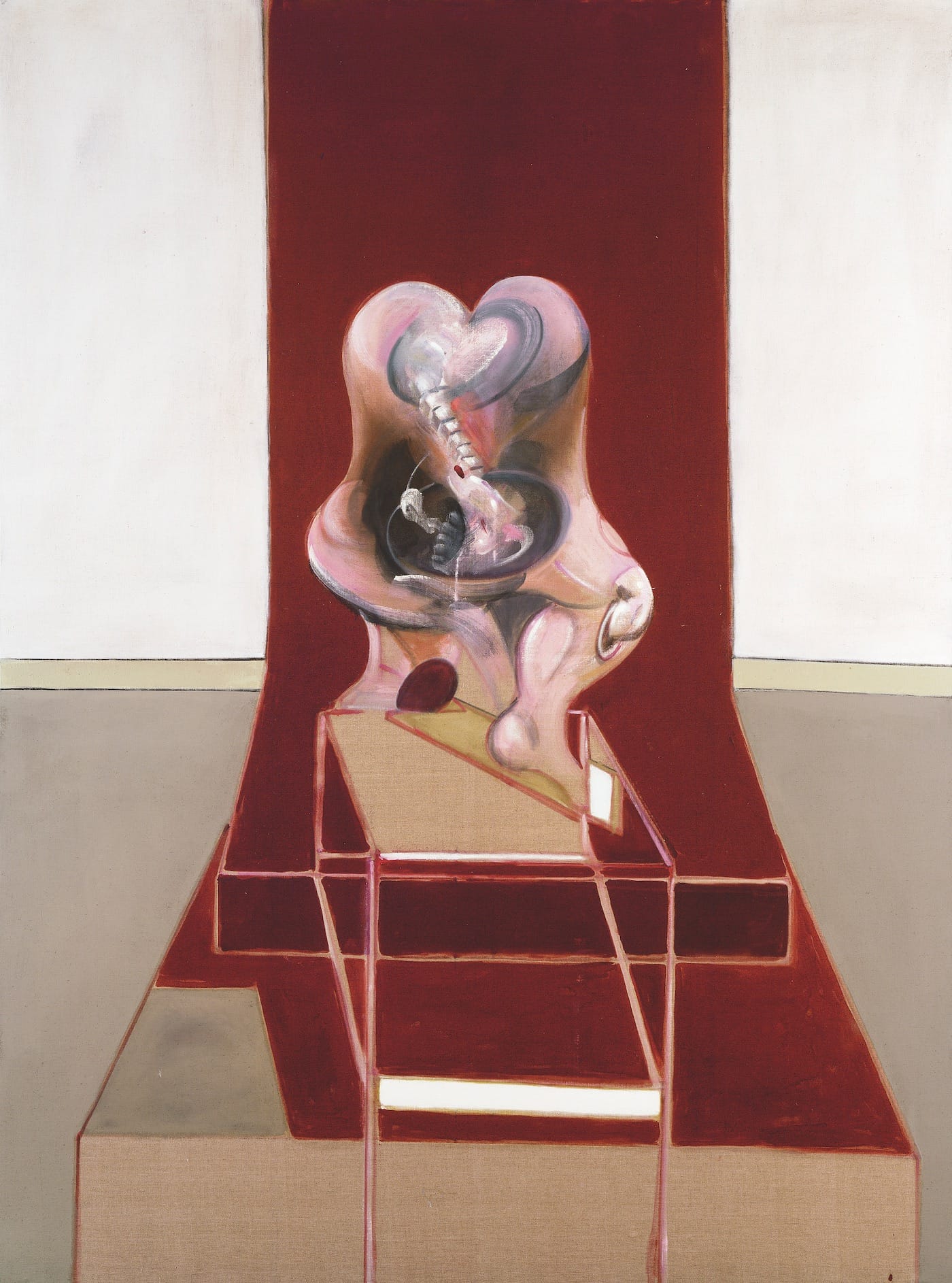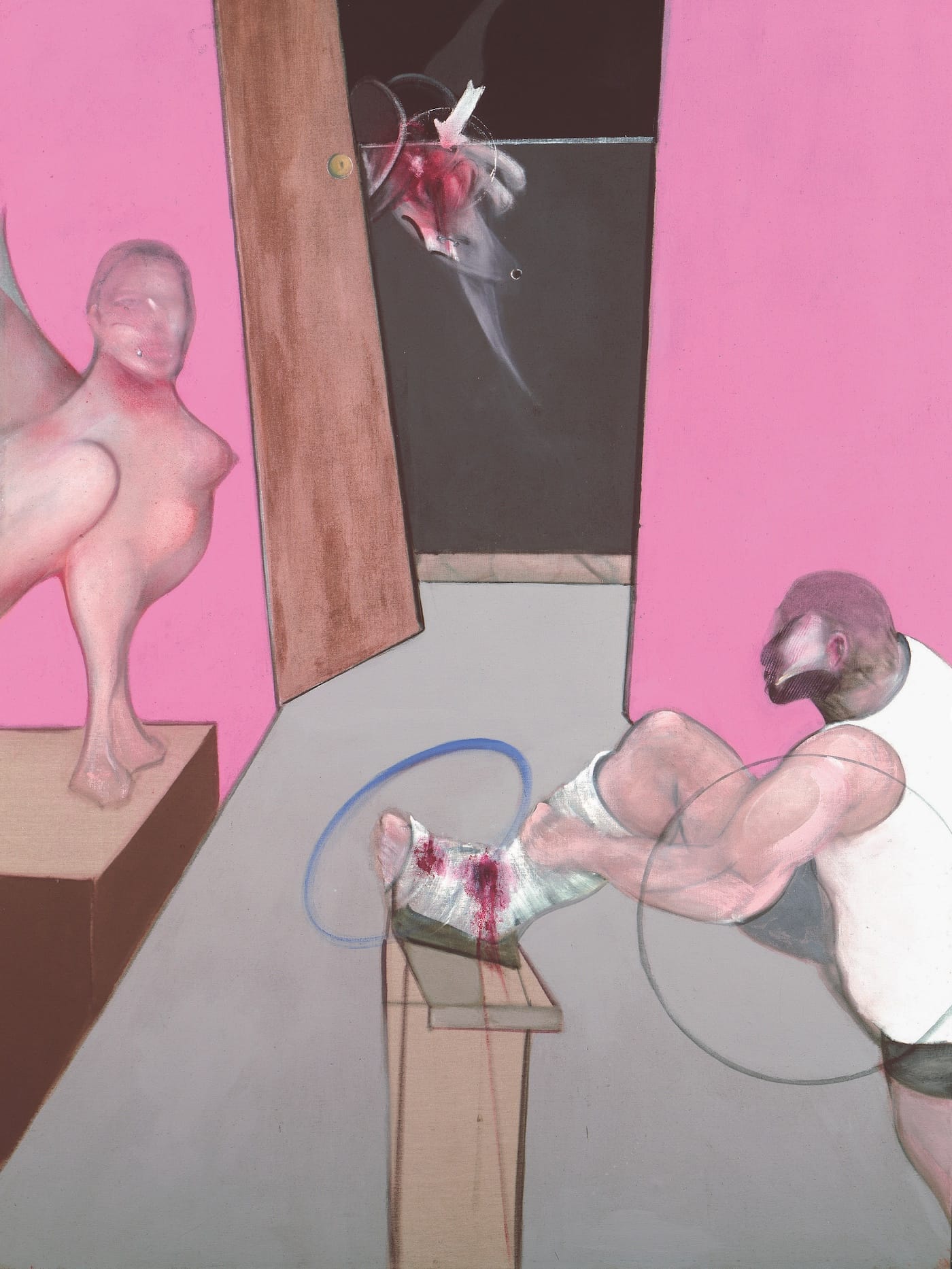 Approaching Bacon through Aeschylus’s Oresteia and Christ’s crucifixion, Philippe Sollers traces the artist’s transposition of those ancient leitmotifs into mundane experiences, defining the contemporary condition as a series of muted catharses in which the body is “stiffened” by its muffled “cries.” Philosopher Gilles Deleuze reads Bacon’s agonies as originating simultaneously within and without, as the pictures’ “athletic” bodies brace for blows by exterior forces embodied by Bacon’s blocky color and abstract forms, while the figures’ paralysis makes visible their inchoate reactions to internal stimuli.
