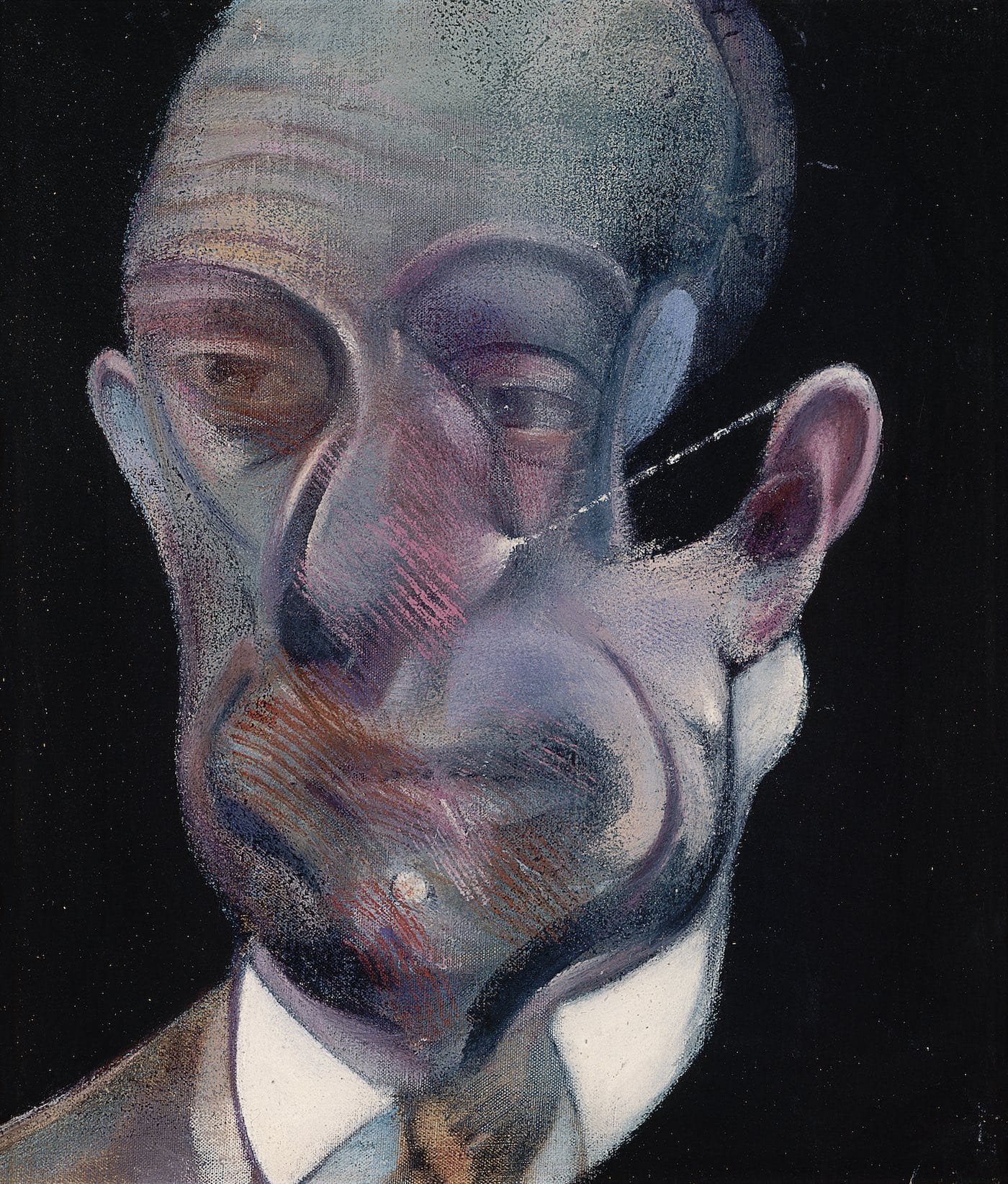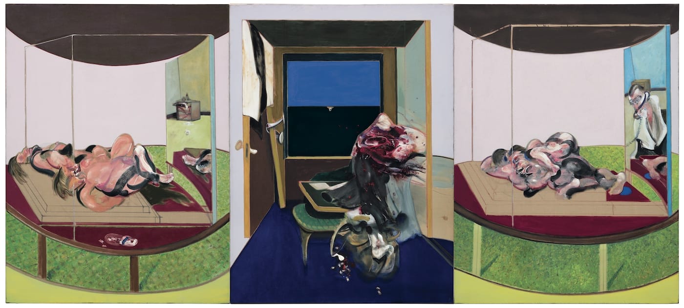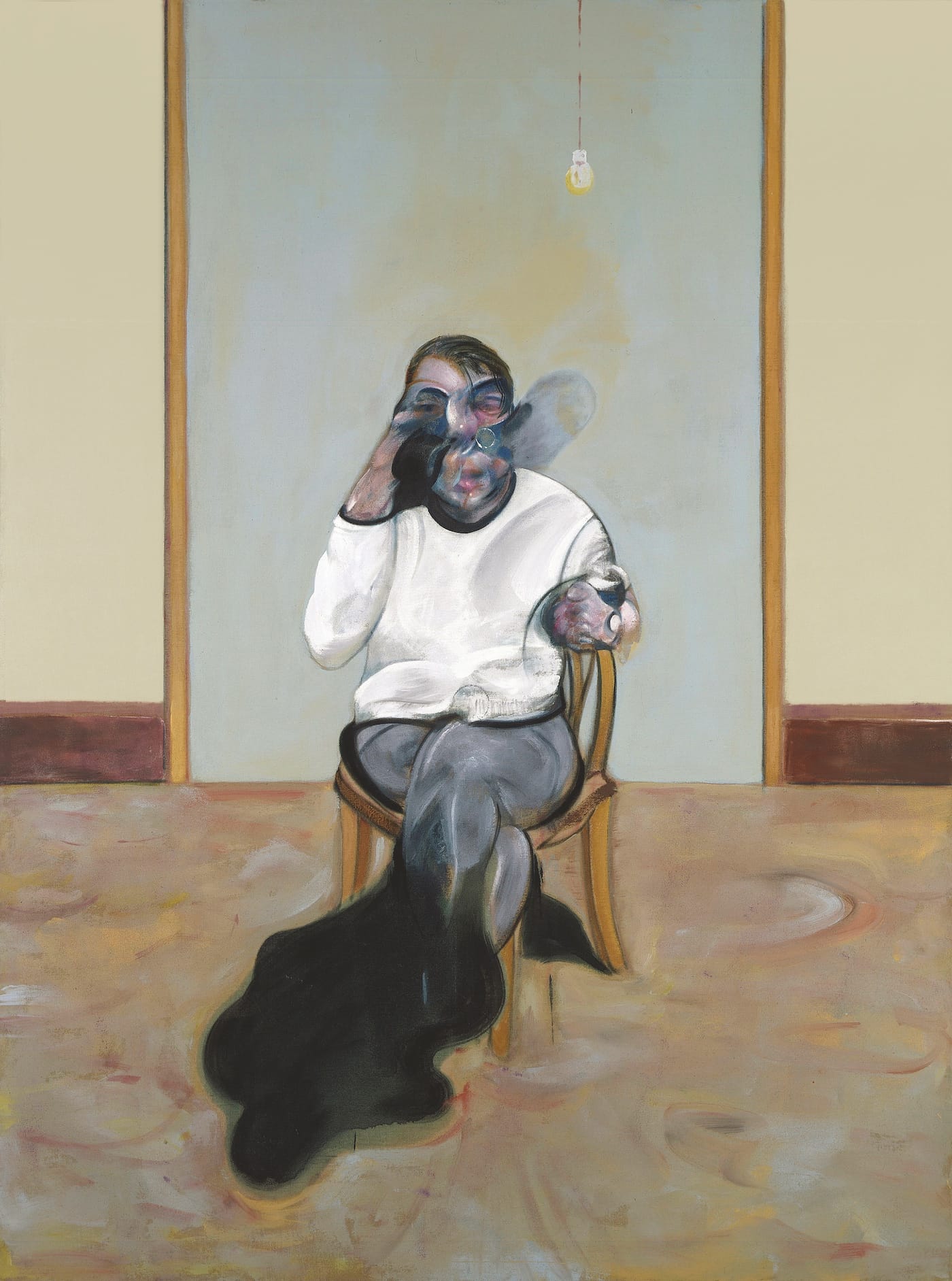 In the triptych, “Three Portraits – Posthumous Portrait of George Dyer; Self-Portrait; Portrait of Lucian Freud” (1973), the artist tracks the inevitable dissolution encoded into human bonds. In the left panel, a naked George Dyer sits in a bare room beneath faux-black-and-white photograph of Bacon pinned to the wall. On the far right, the artist Lucian Freud sits unaccompanied in that same bare room, but under a faux-photo of Dyer. The realms of art and friendship merge; absence turns to presence; presence becomes absence. But loss remains central. In the middle painting Bacon portrays himself alone. He gazes forward, his face chiseled and hollowed by grief as he sits flanked by his deceased lover and his distant friend.